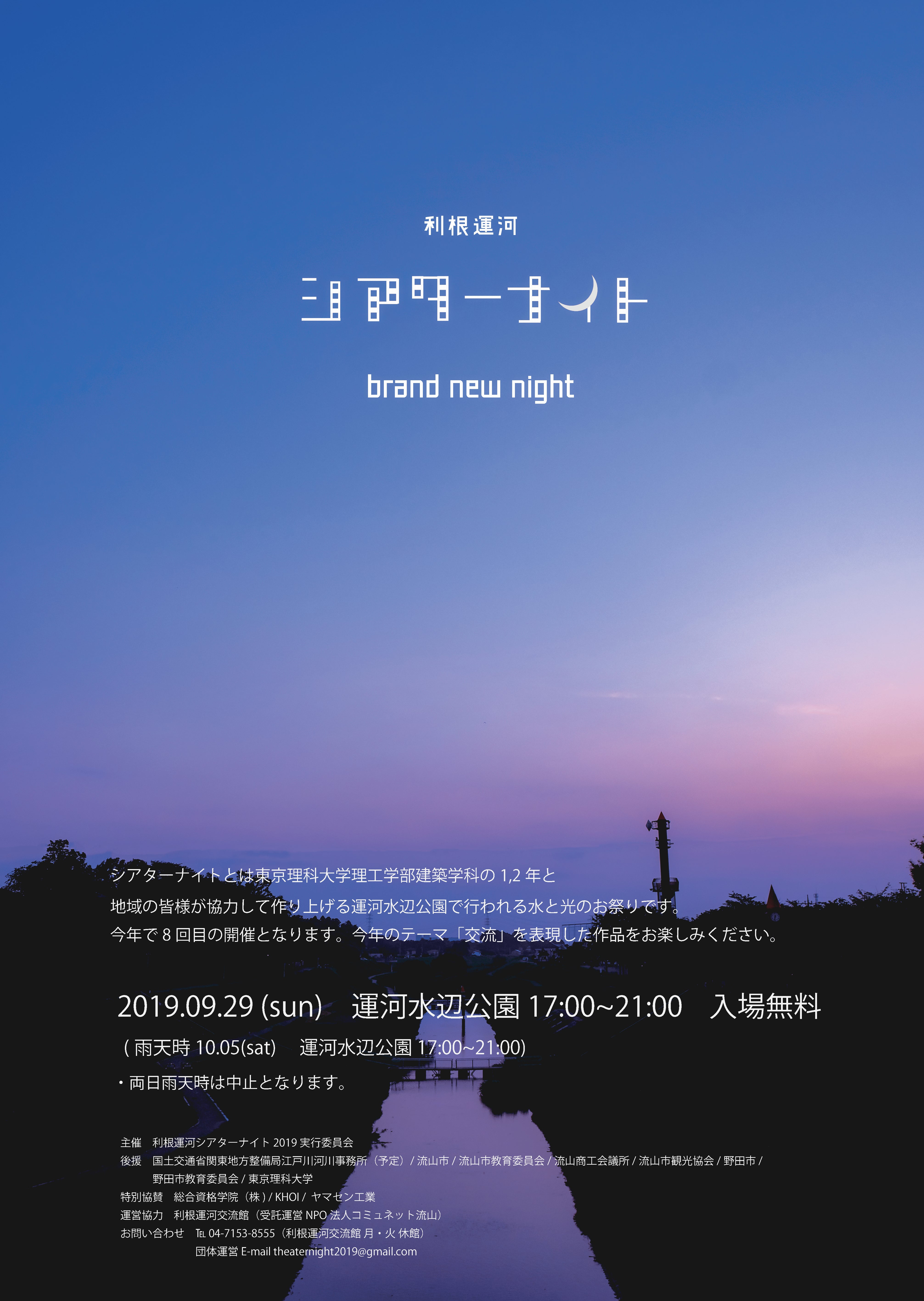 「利根運河シアターナイト」とは、例年秋ごろに利根運河を舞台に開催する光と水の祭典です。「シアター」を映画館ではなく劇場ととらえ、「利根運河を一夜限りの劇場に」というテーマで、学生によるインスタレーション・ワークショップ・パフォーマンス・映像放映他、市民出店者様による飲食物等の販売等を行い、市民・学生・その他多くの方々が日常とは異なった利根運河を共に体験・記憶できるような参加型のイベントとなっています。例年、多くの地域の方々からのご理解とご協力を賜り、新たな交流を生む場として2012年より本イベントは続いて参りましたが、昨年は新型コロナウイルスの感染拡大により中止となり、今回で9回目を数えます。(※下は2019年度のポスターです。)
