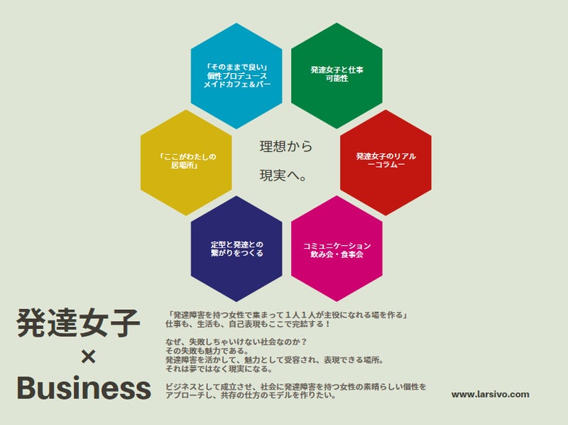 また、人よりも挫折や失敗の経験が多く、自信や自己査定感が乏しいという現状があります。私は、それを崩してプラスに変換していく【発達障害がある女性の新しい活躍の場】を創りたいと考えています。