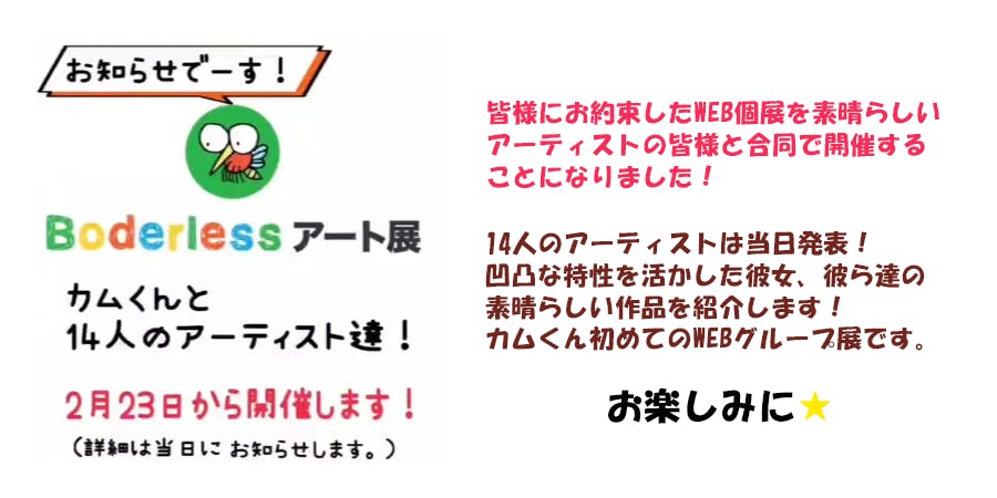2022/02/21 14:59こんにちは。お久しぶりです。kammosquitoです♪支援者の皆様にお約束した個展の開催を、コロナ渦ということもありWEB上で誰でも楽しんでいただけるように準備いたしました。kammosquito単体での開催も考えましたが、せっかくならInstagramのフォロワーさんの中から素晴らしい作品作りをしている方にお声掛けさせていただき、合同で出展することになりました。日程は2月23日(祝日)時間は12時オープンです。入場URLは当日にこの活動報告にてお知らせいたします。※Instagramでも告知予定作品について出展者様からのコメントや、kamくんからのコメントも掲載します♪是非お楽しみいただき、SNS等でシェア、拡散していただけたら嬉しいです。それではしばらく今お待ちくださいませ。kammosquito もっと見る