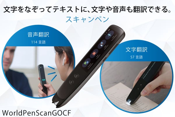 今回、新しく「WorldPenScan GOCF」(ワールドペンスキャンゴーシーエフ)をリリースいたします。本製品は、文字をなぞってテキストに、文字や音声も翻訳できる多機能スキャンペンです。CFの意味は最新のシステムバージョンを利用できる クラウドファンディングエディションになります。新しく縦書きスキャン、スマホダイレクト入力など機能をご利用いただけます。