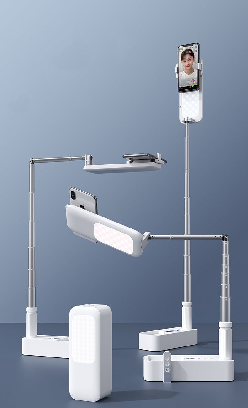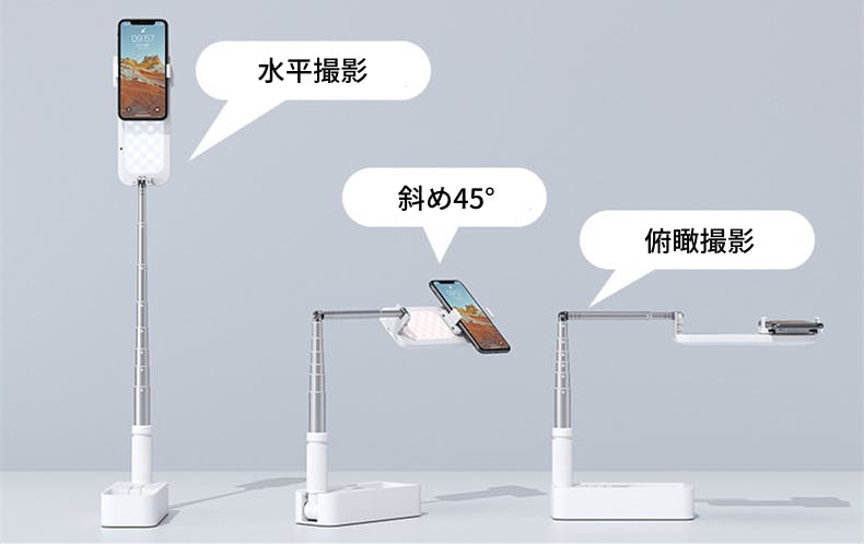 道具はスマホ一台でOK!セッティングはたったの10秒!130cmまで高さを調整でき、二軸360°回転で、スマホの角度や向きも自由自在。折り畳めばお弁当一個分で持ち運び楽々。USB充電式で、どこでも手軽に撮影を始められる。両面LEDライトで被写体がより立体的に。Bluetoothリモコンで操作楽々。