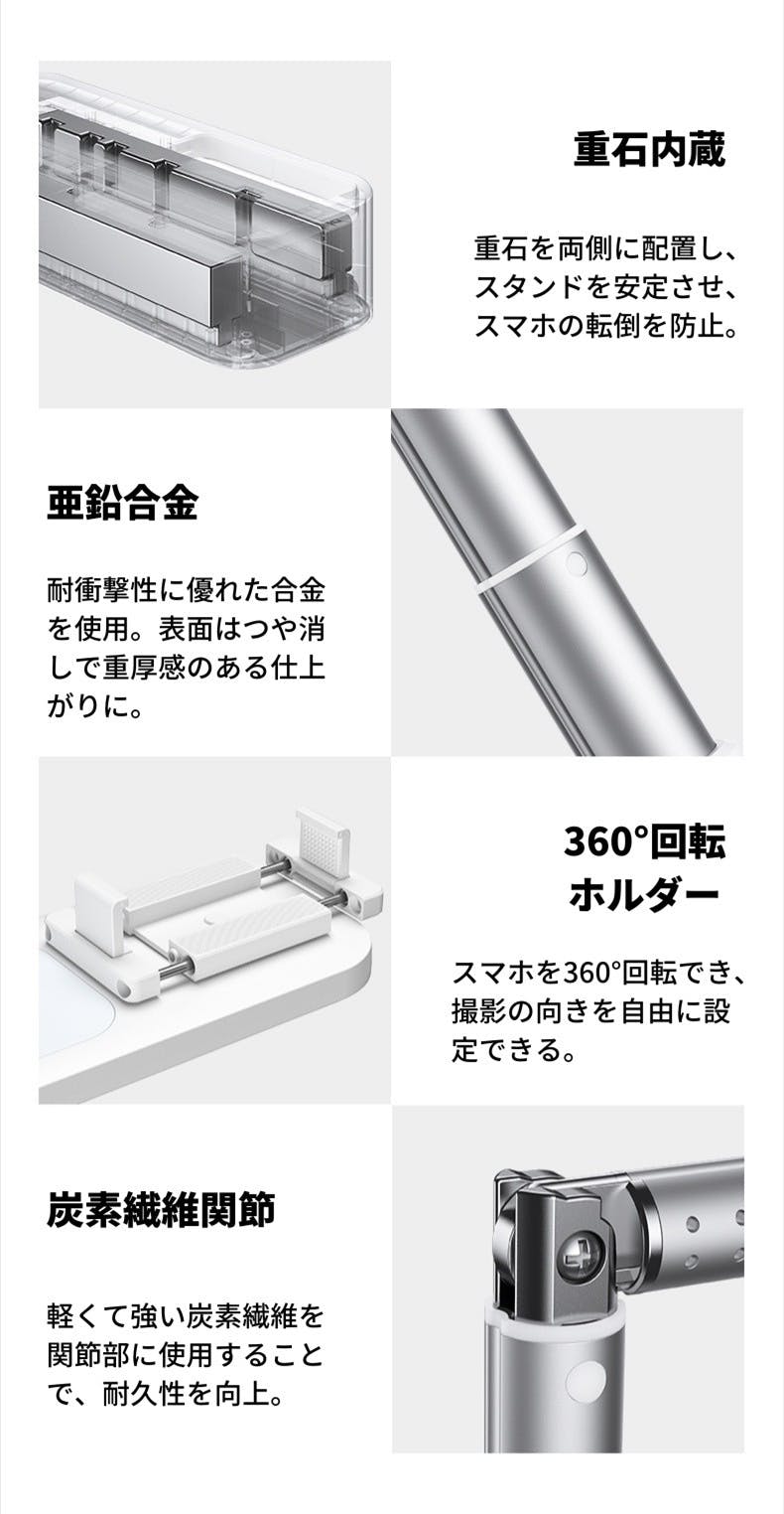 • ・130cmまで自由に高さを調整でき、二軸360°回転で、スマホの角度や向きが自由自在。