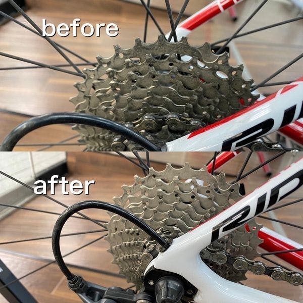 SENSHA Bicycleの洗車【プレミアムバイクウォッシュ】では、チェーンなどのひどい油汚れだけではなく、長年かけてこびり付いた水垢や変質した汚れなど、一般的な洗浄では落とすことが難しい汚れも、5種類を超える特殊な洗浄剤や器具を駆使して洗い流します。