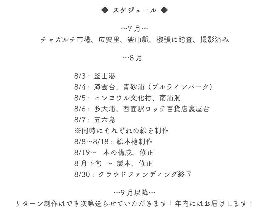 本は20~30ページ、見開きに一つは絵を入れる予定です。韓国で製本して日本に届けます!