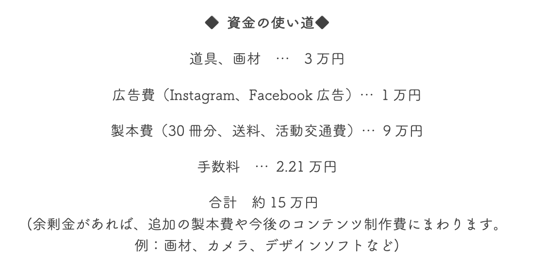 ●対価以外に必要な費用:プロジェクトページ、リターンに記載のとおり。