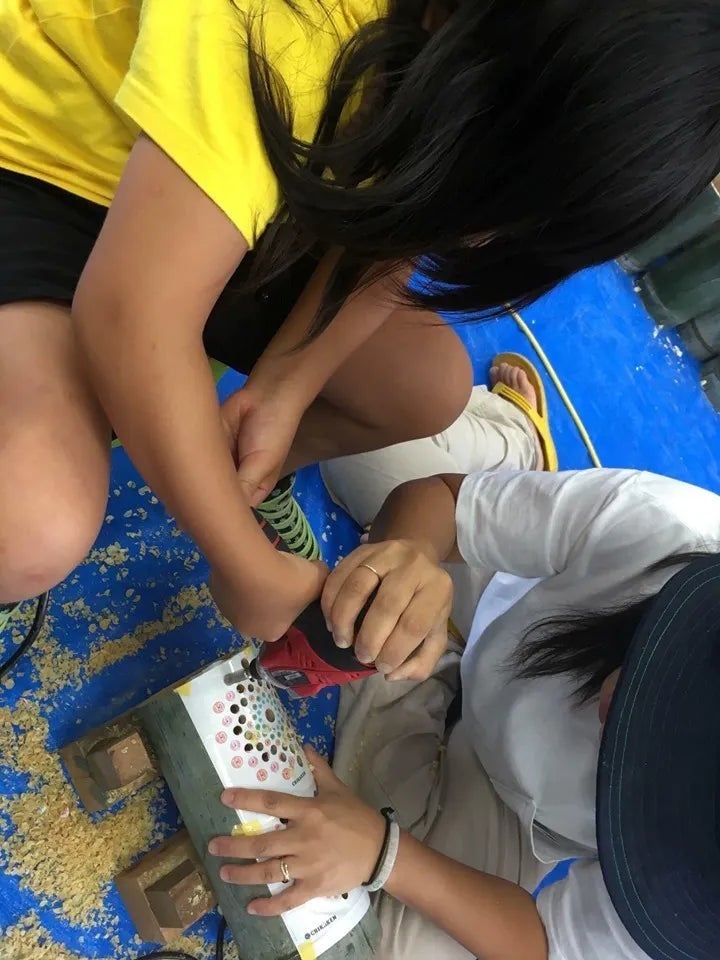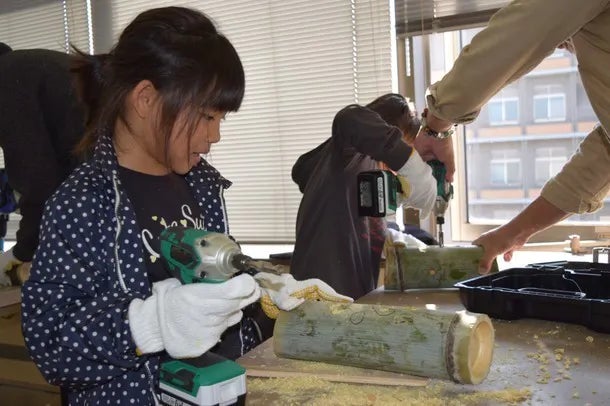 力のある大人達に竹を切ってもらい、ワークショップで専用のドリルを使いながら大小さまざまな大きさの穴を開けて、竹あかりを作成。