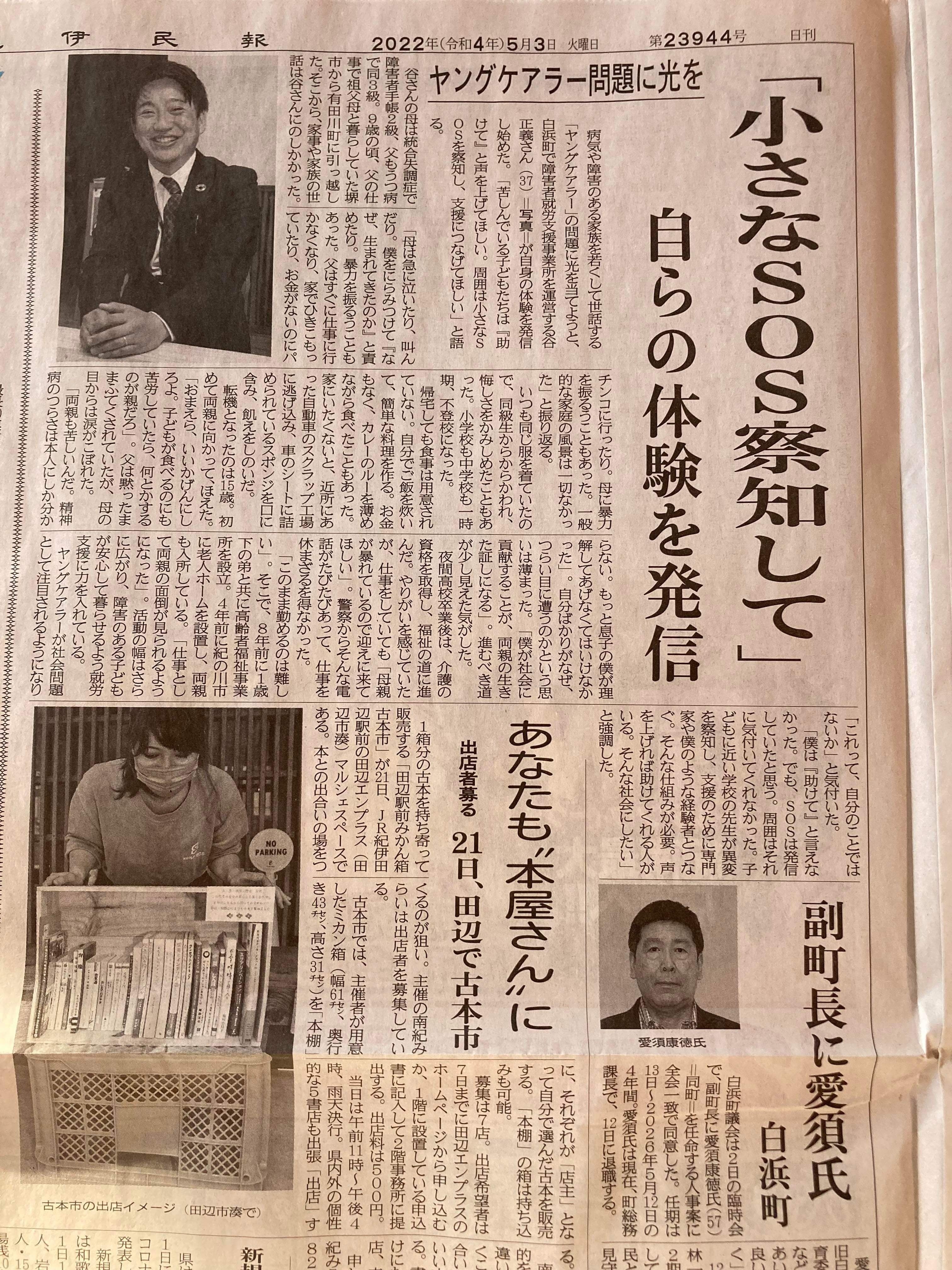 私ごとですが、明日のAGARA 紀伊民報2022/05/03(火)付けの9面に私のヤングケアラーの記事が掲載されました。ぜひ、お時間宜しければ、ご覧ください^_^ #紀伊民報 #ヤングケアラー #谷正義 #小さなSOSに察知して