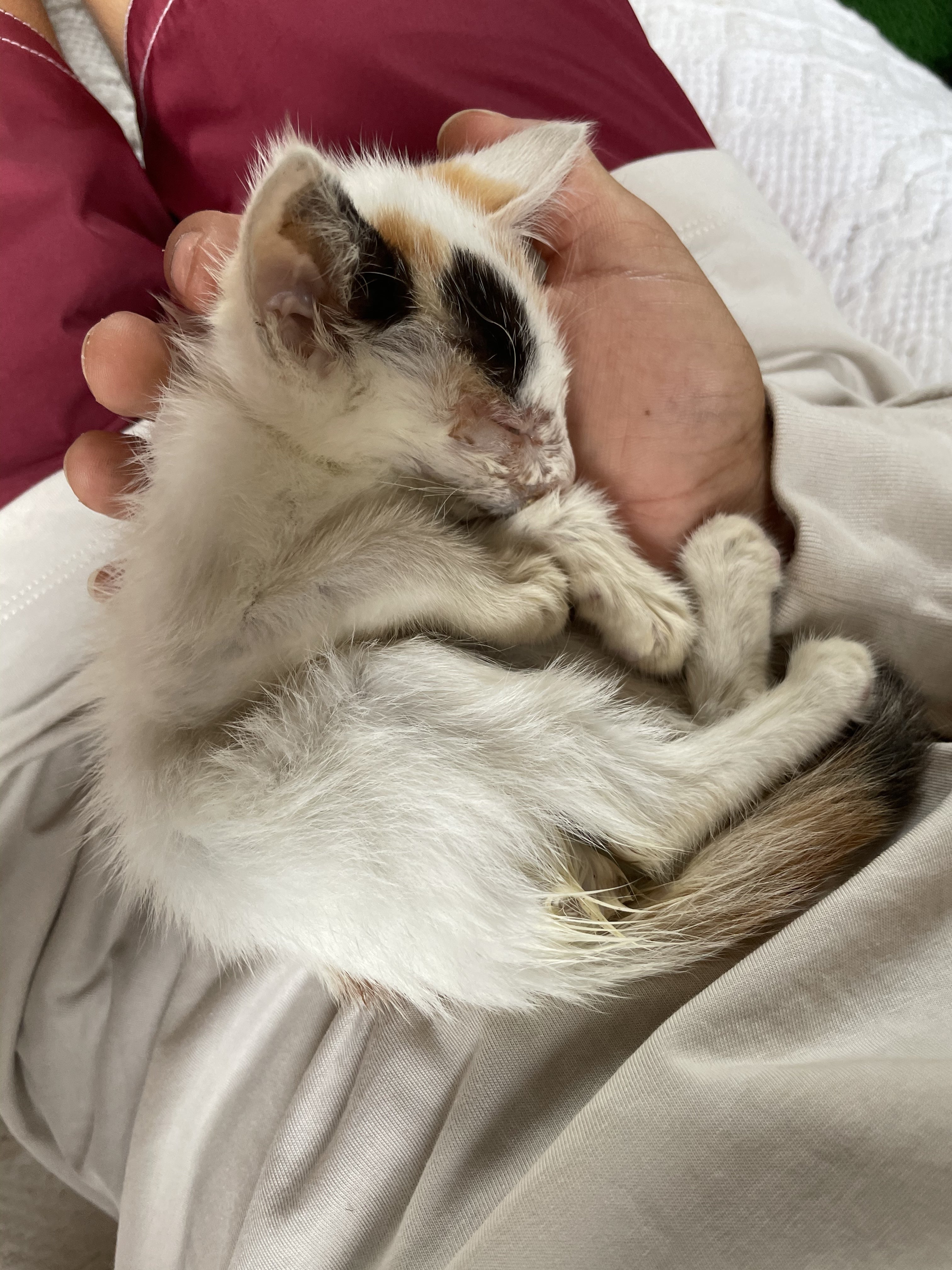 車を停めて見てみると両目から血を流しずぶ濡れの子猫です。拾いあげると微かに鳴きました。お店の準備中で資金の無かった私はSNSでこの子の為の寄付を募りました。