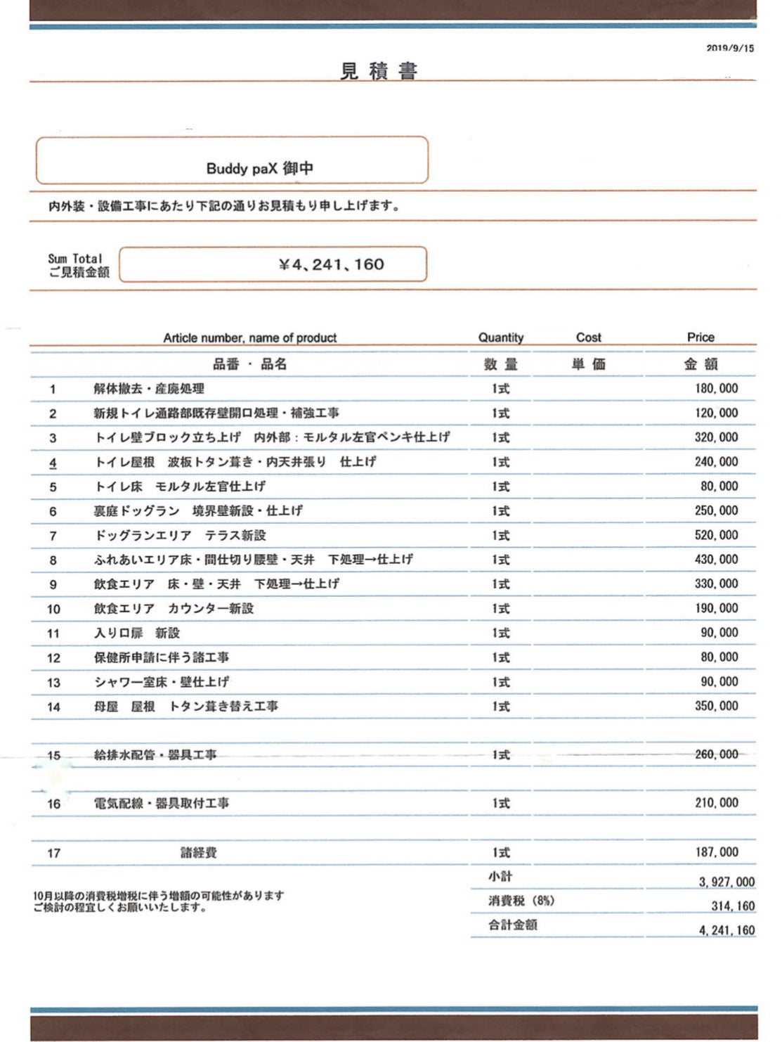 ※こちら物件取得当初の2019年の見積書になり、消費税率が異なっております。