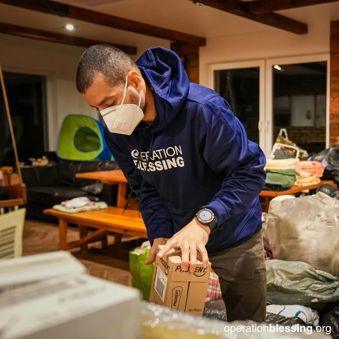 ポーランド国境付近メディカでは、Operation Blessing国際救援チームが避難民支援を続けています。食料、水、浄水器、毛布、ソーラーランプ、携帯充電器、衛生用品ほか、当面必要な物資を手渡し、暖かい飲み物やスープで出迎えます。