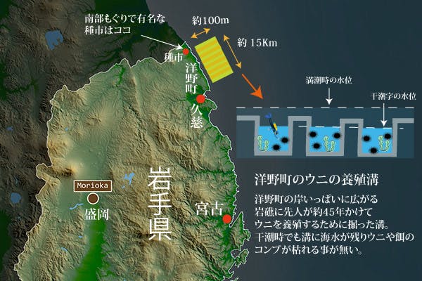 うに牧場は洋野町の沿岸に広がる岩盤底の浅瀬に溝を掘り、