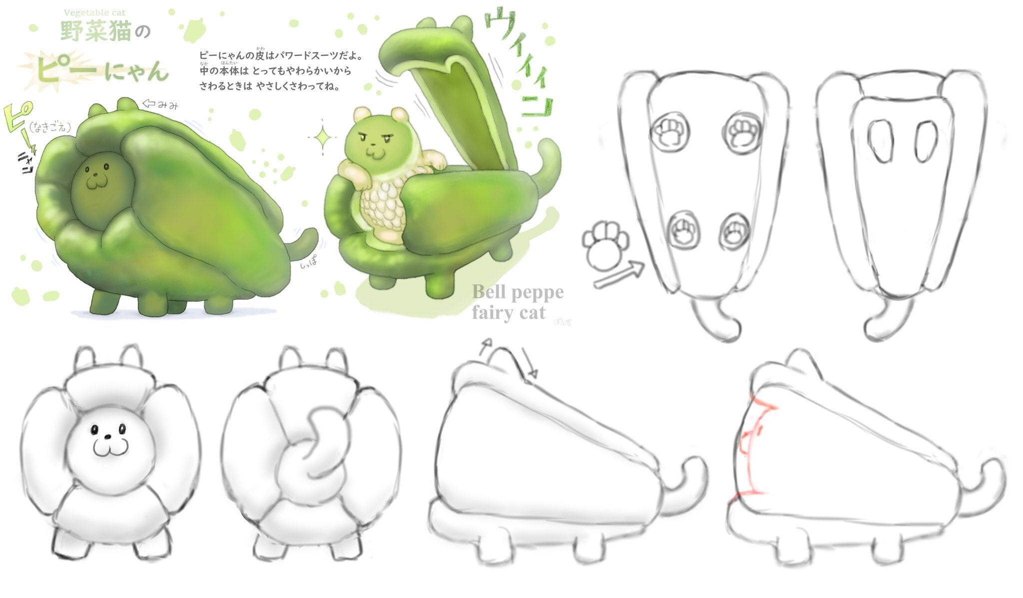 子供が嫌いな野菜、3位のピーマンですが、子供達が喜んでくれる可愛いピーマンの猫妖精がいれば、ピーマンが苦手な子供も好きになってくれる切っ掛けになるかもと思いデザインさせて頂きました。