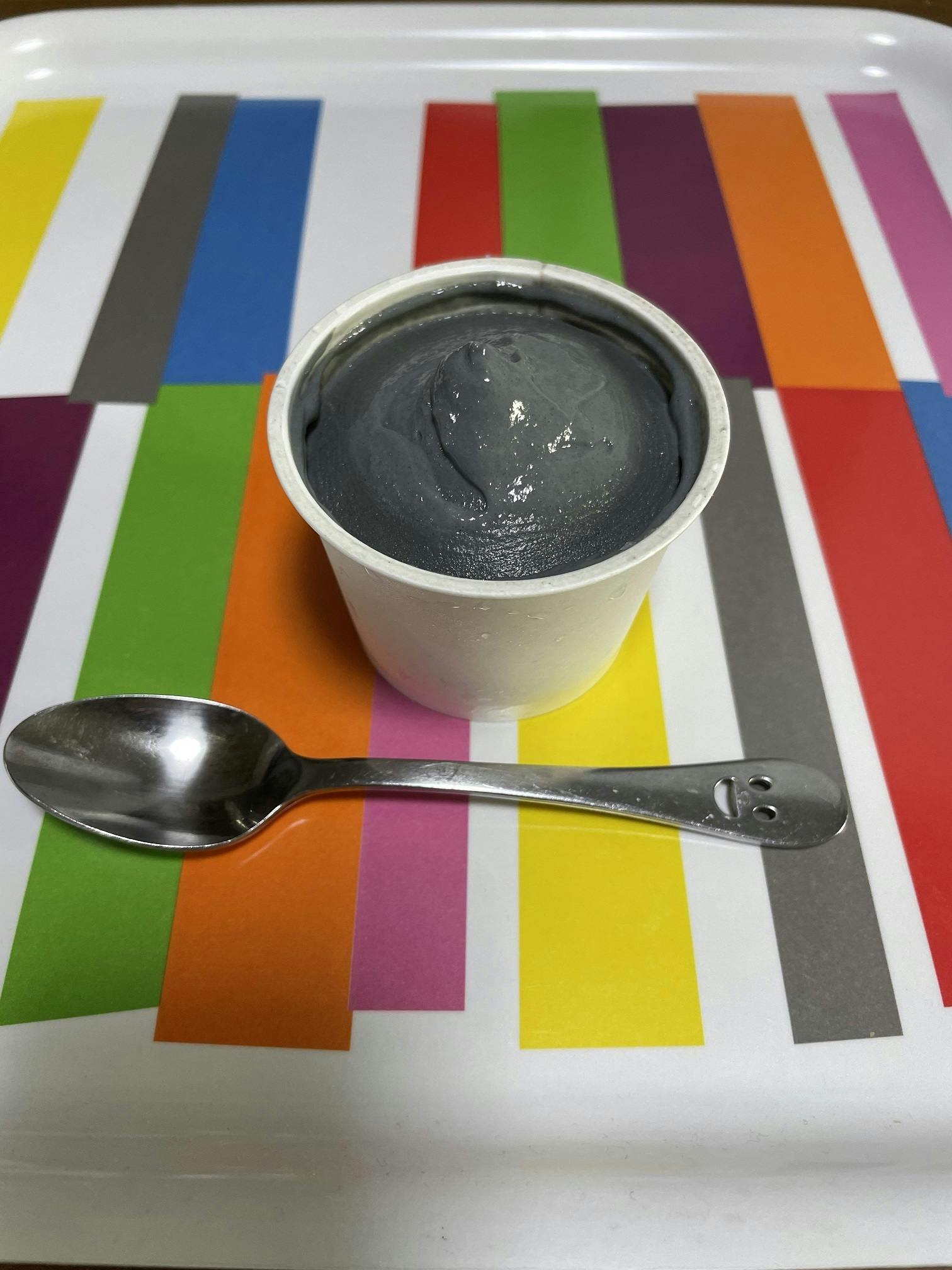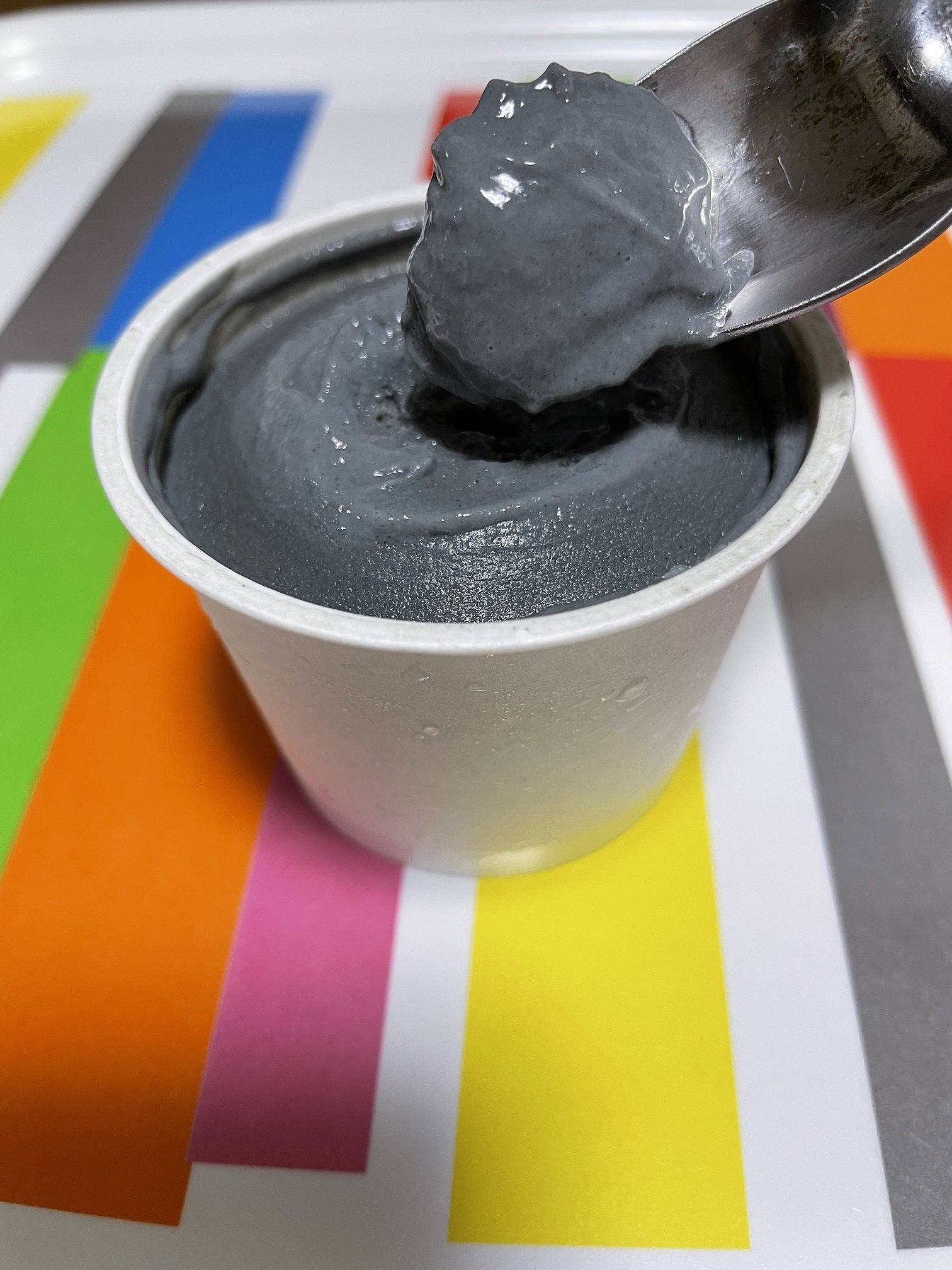 本日は黒ゴマ味のサンプルチェックを行いました。写真は黒ゴマ味のサンプルです。有機JAS認定を受けた黒ゴマをふんだんに使用している為、真っ黒です。口に含むと香り高い黒ゴマの風味が口の中に広がり、香りが鼻から抜けます。