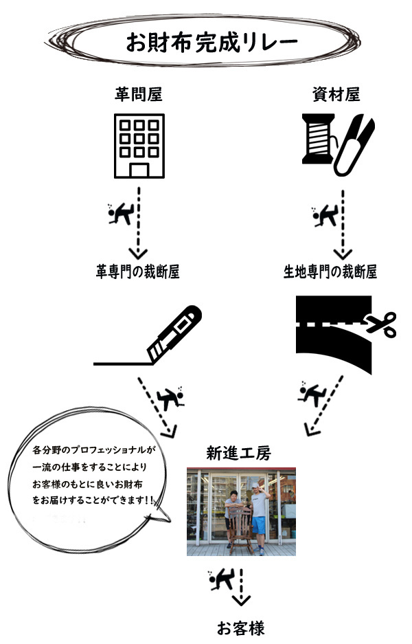 お財布はお客様の手に届くまでに多くの中間マージンや物流コストが発生しています。それに比べて新進工房の仕組みはシンプルです。