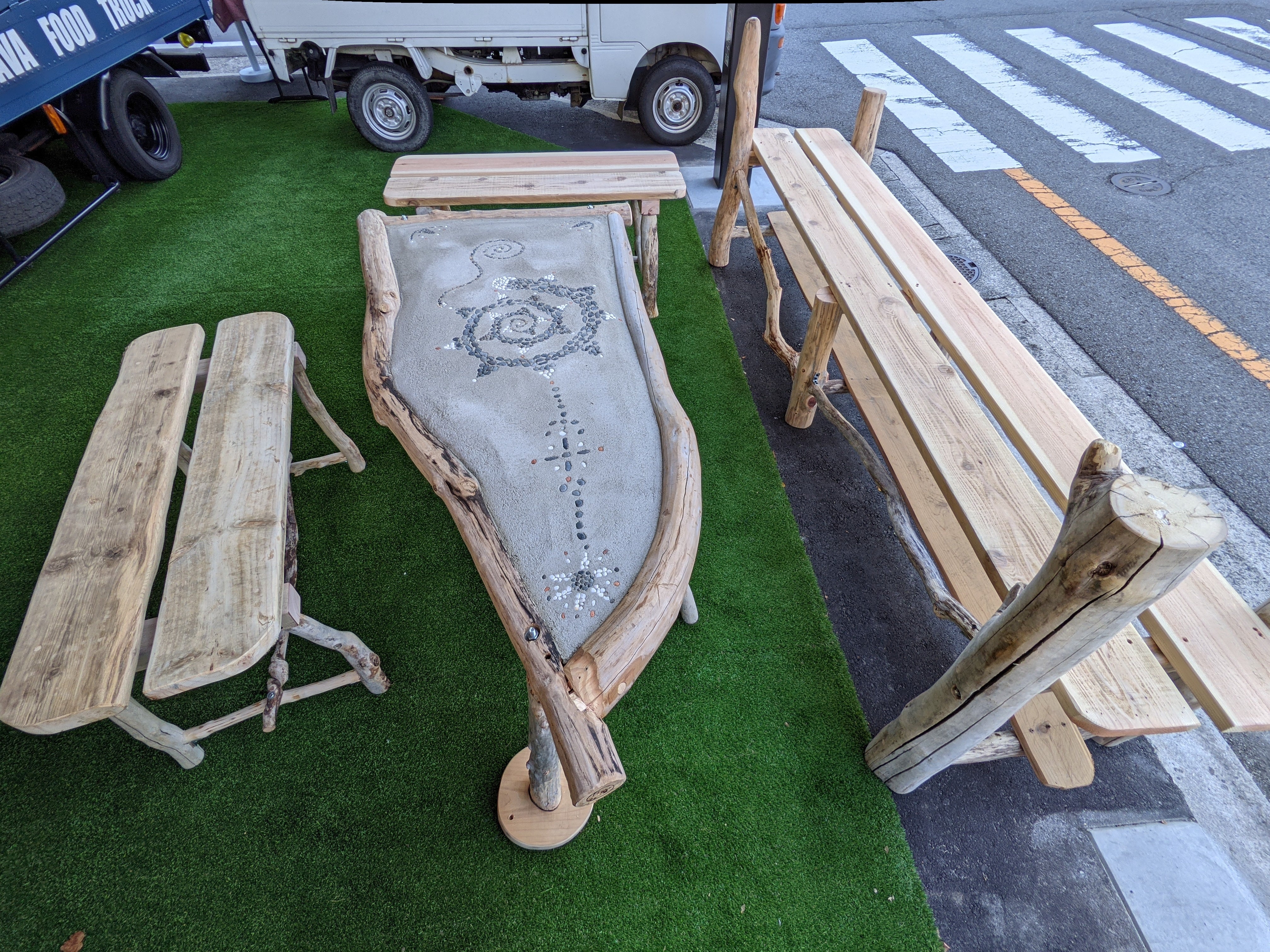 シロキタキッチンパークさんへ流木のベンチとテーブルを設置してきました。