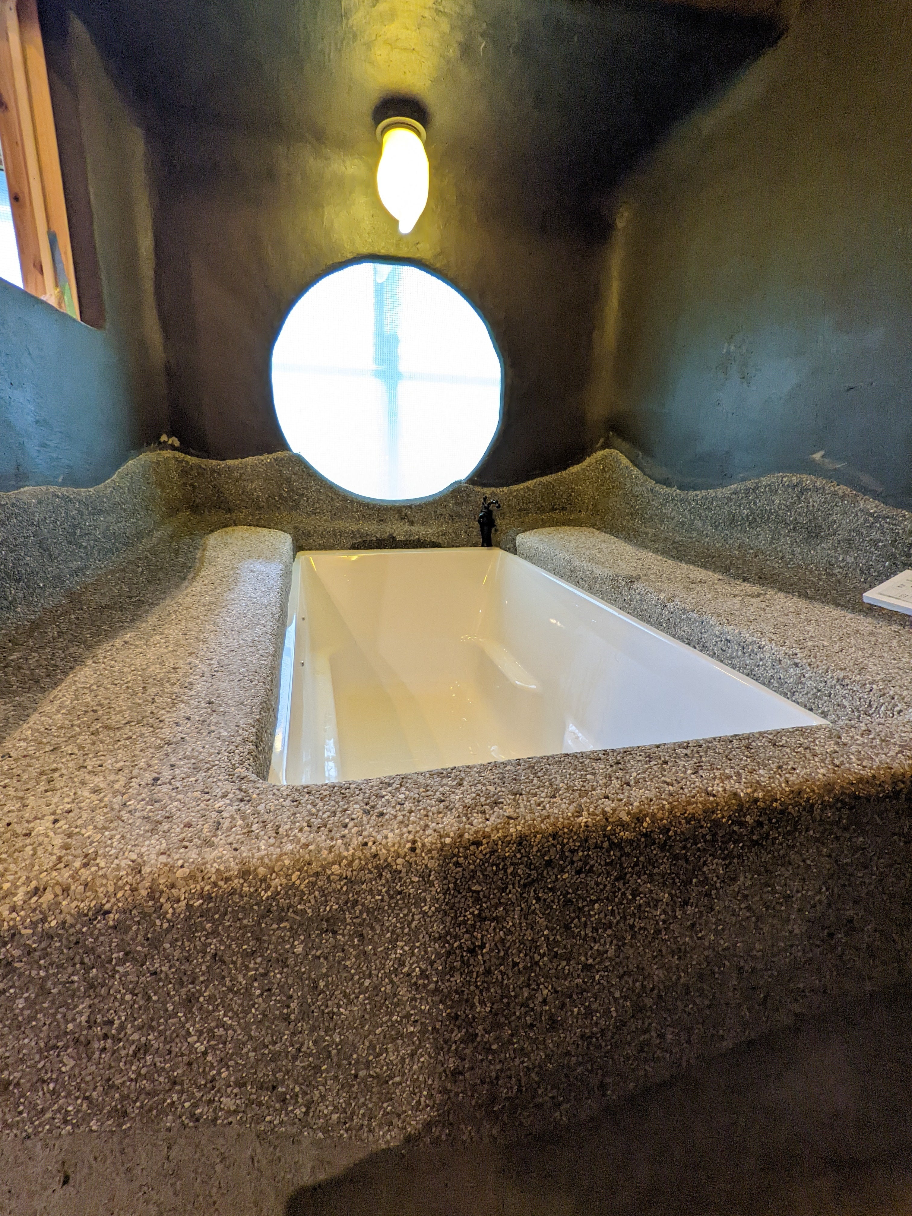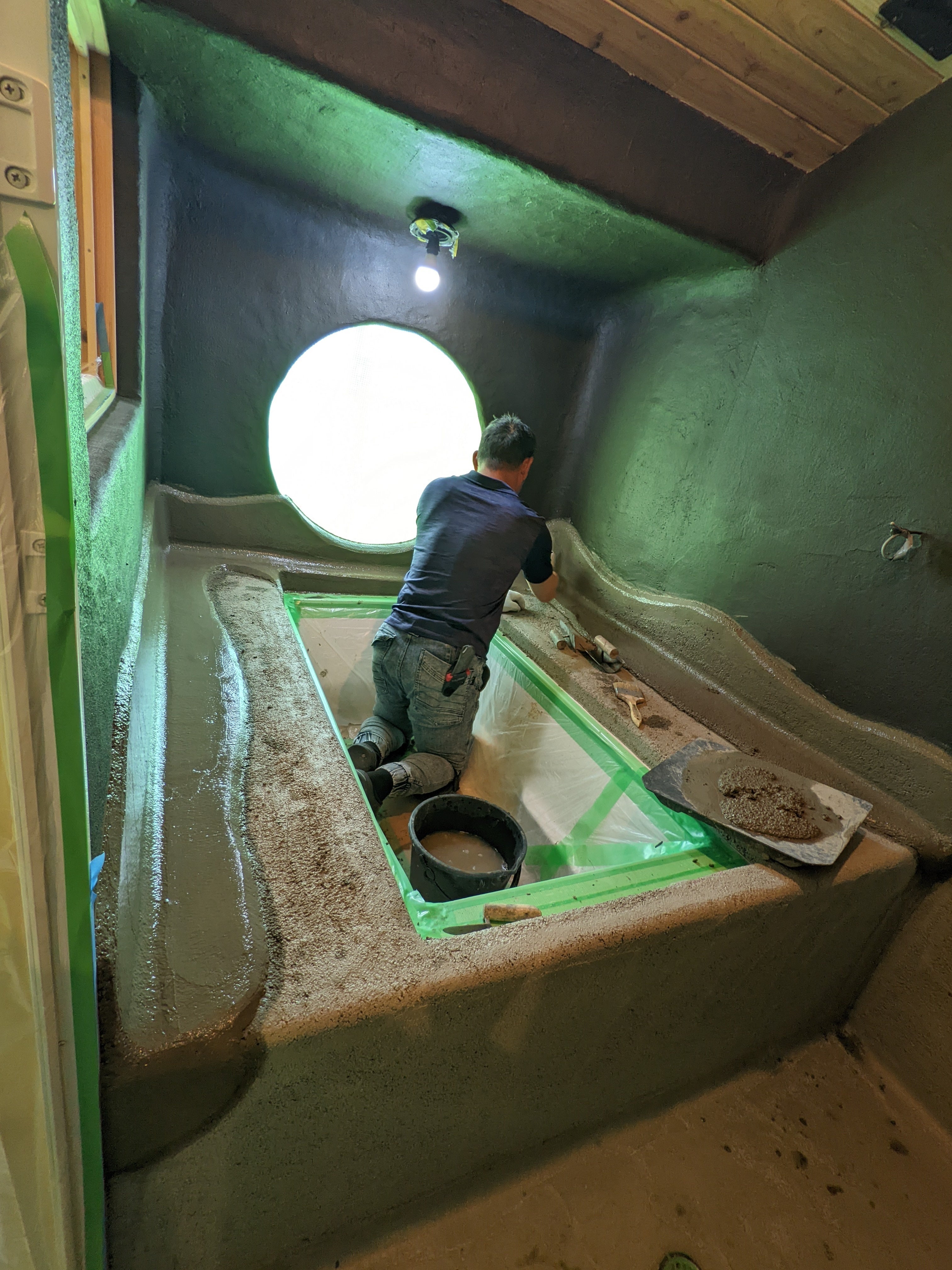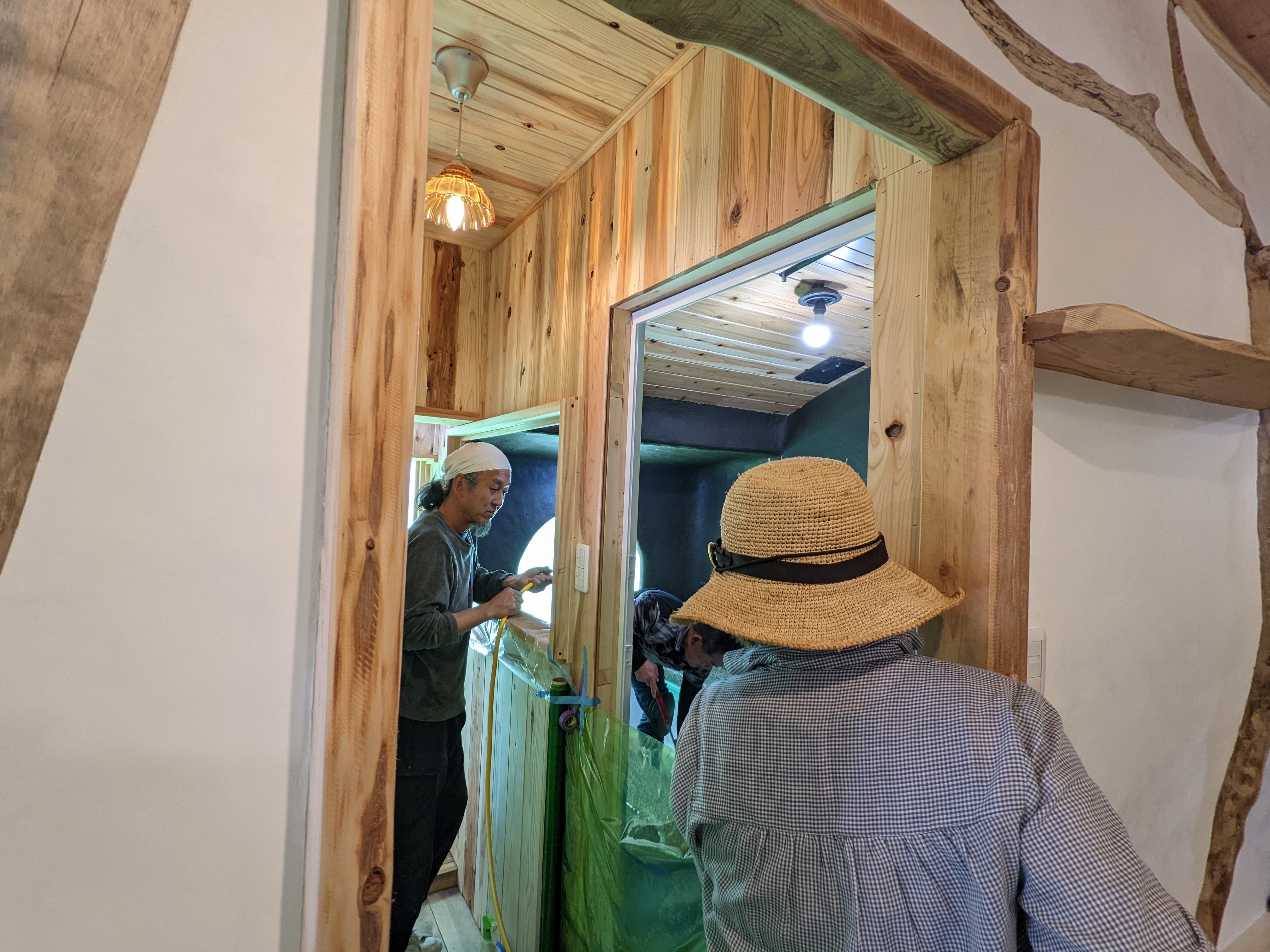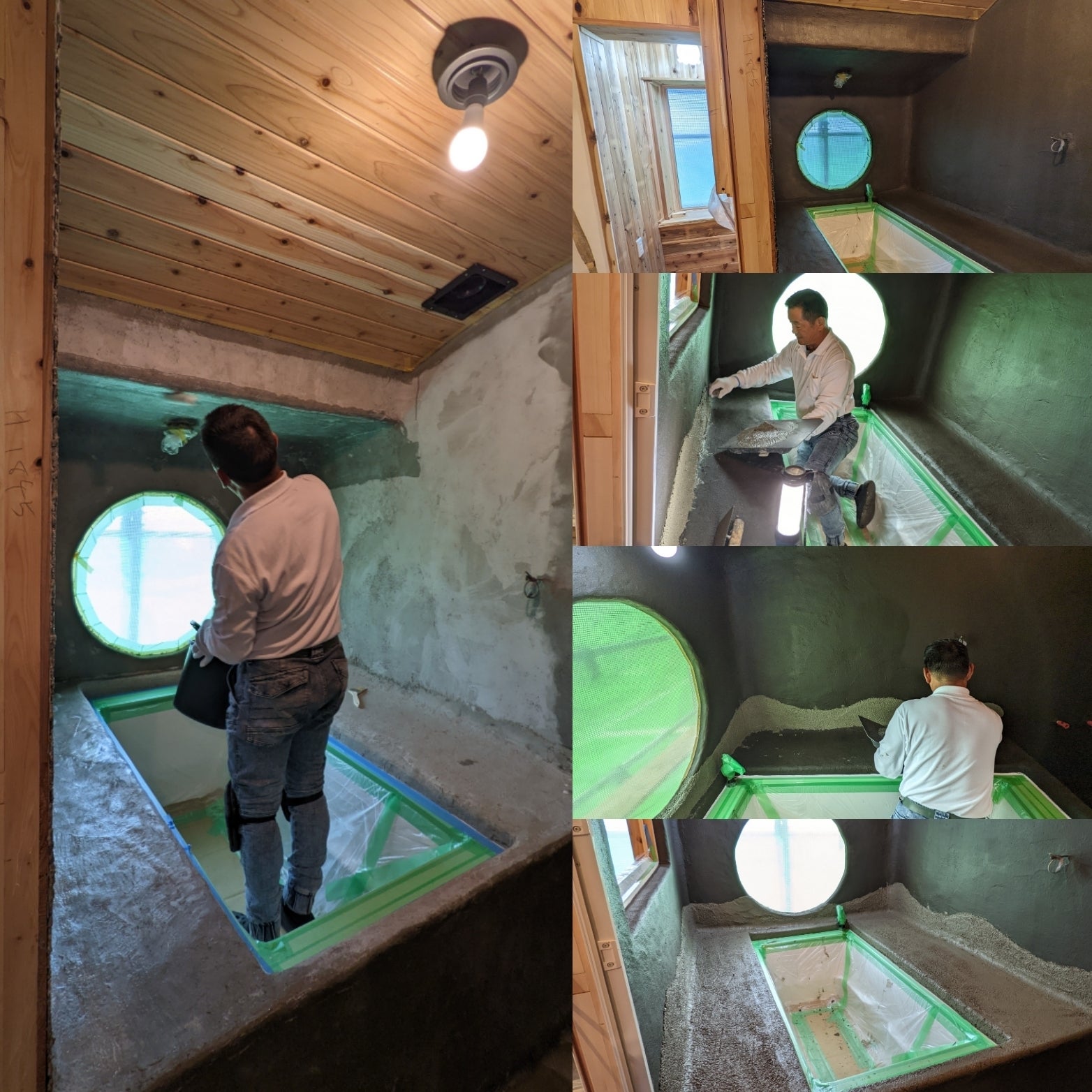 壁の黒い防水材の手前までは何とか塗り形をつくりましたが、仕上げはやはり今までの仕事のパートナーに助けを求めました。
