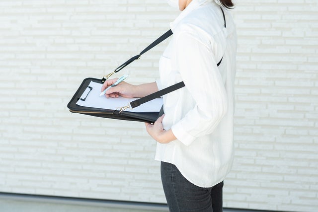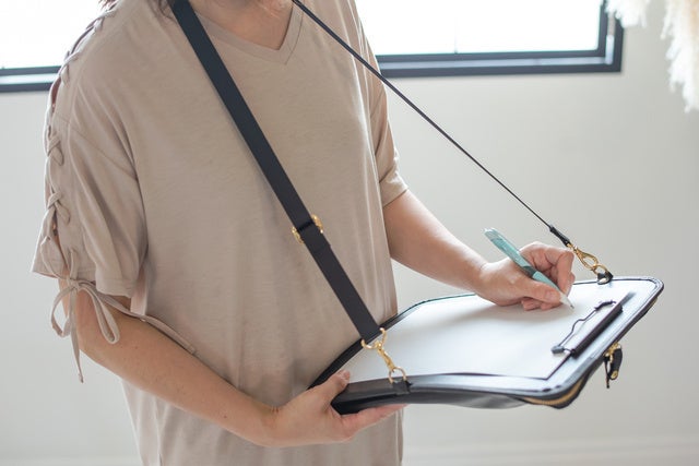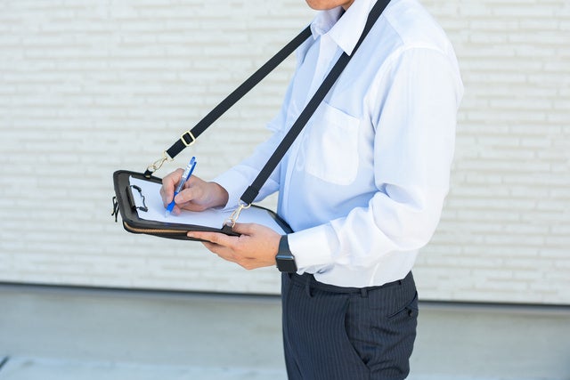 立ち作業でバインダーを記入する際は片手でバインダーを押さえながら書かかざるを得ないので安定感がないのですが、「バインダーバッグ」の場合はショルダーベルトを肩から通して固定できるので安定感があり記入がしやすいです。