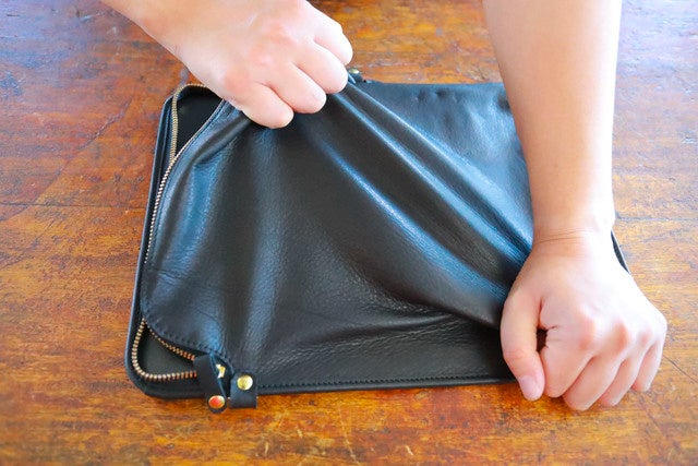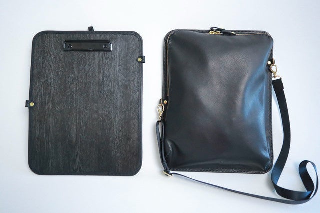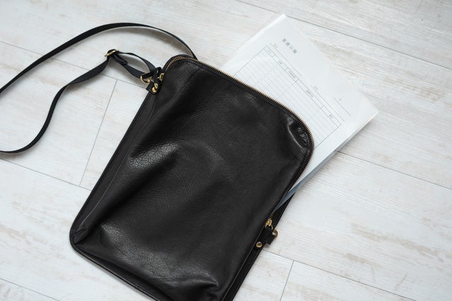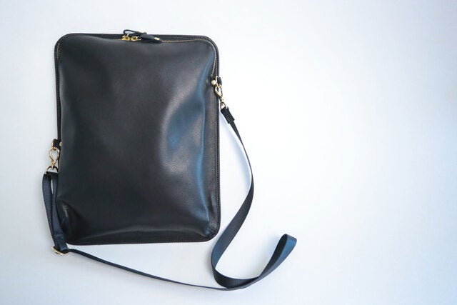 シンプルなブラックレザーで仕上げたバインダーバッグはビジネスシーンにもマッチします。