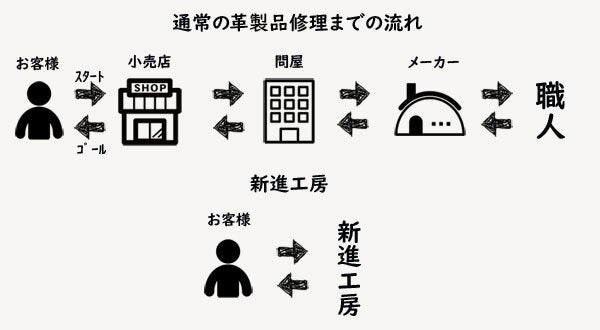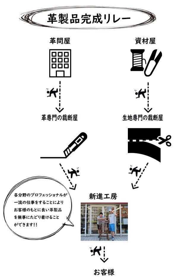 革製品はお客様の手に届くまでに多くの中間マージンや物流コストが発生しています。それに比べて新進工房の仕組みはシンプルです。