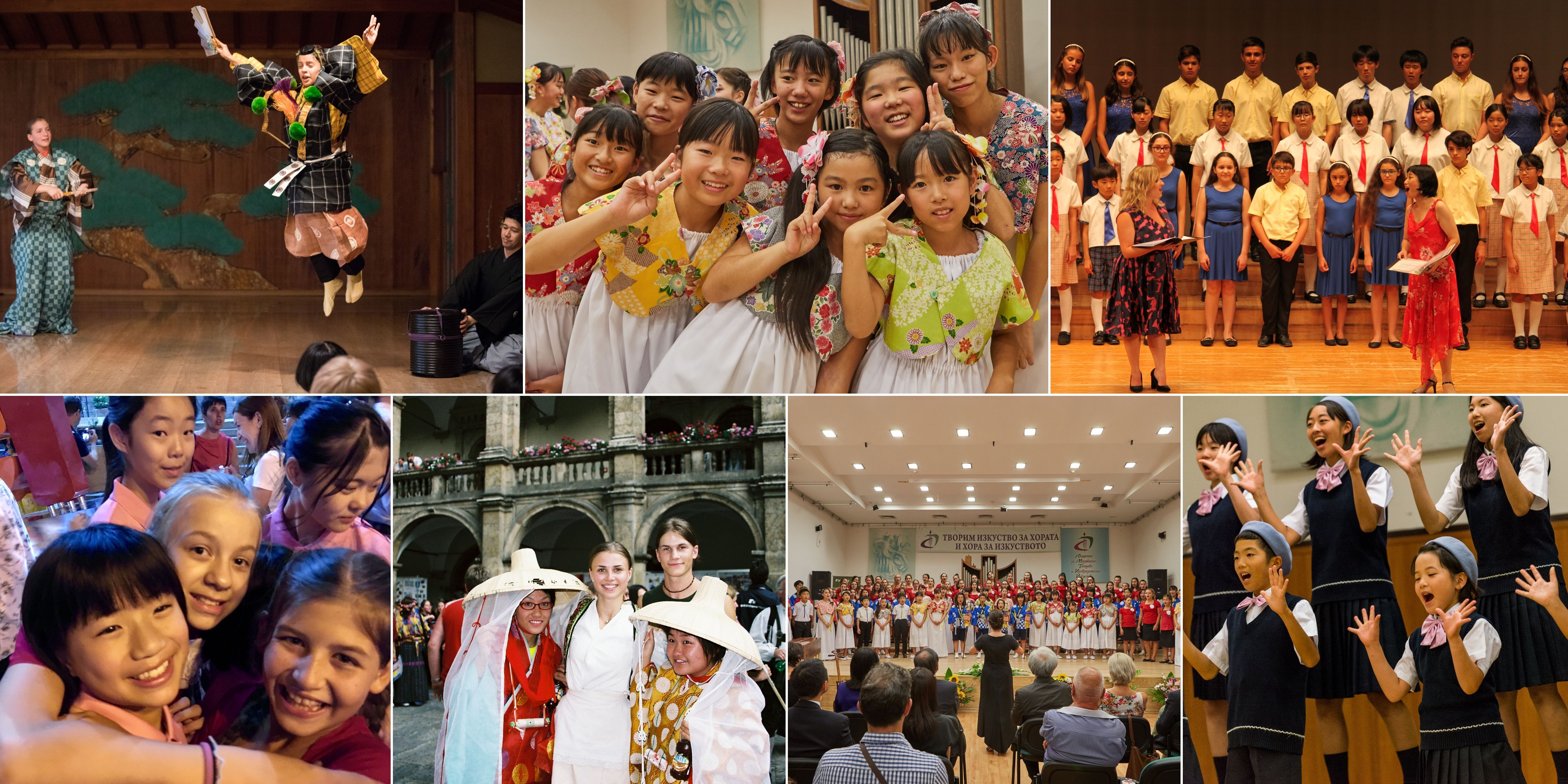 上段左より:チェコ子供狂言in京都(2019)、所沢フィーニュ少年少女合唱団メンバー(国際青少年音楽祭inプロヴディフ2019/ブルガリア)、国際青少年音楽祭in伊勢(2019)、下段左より:友情を深めた子供たち(国際青少年音楽祭inプロヴディフ2019)、国際青少年ミーティング「世界遺産と未来」(欧州文化首都グラーツ2003/オーストリア)、国際青少年音楽祭inプロヴディフ2019(ブルガリア)、山陰少年少女合唱団リトルフェニックス(国際青少年音楽祭inプロヴディフ2019/ブルガリア)