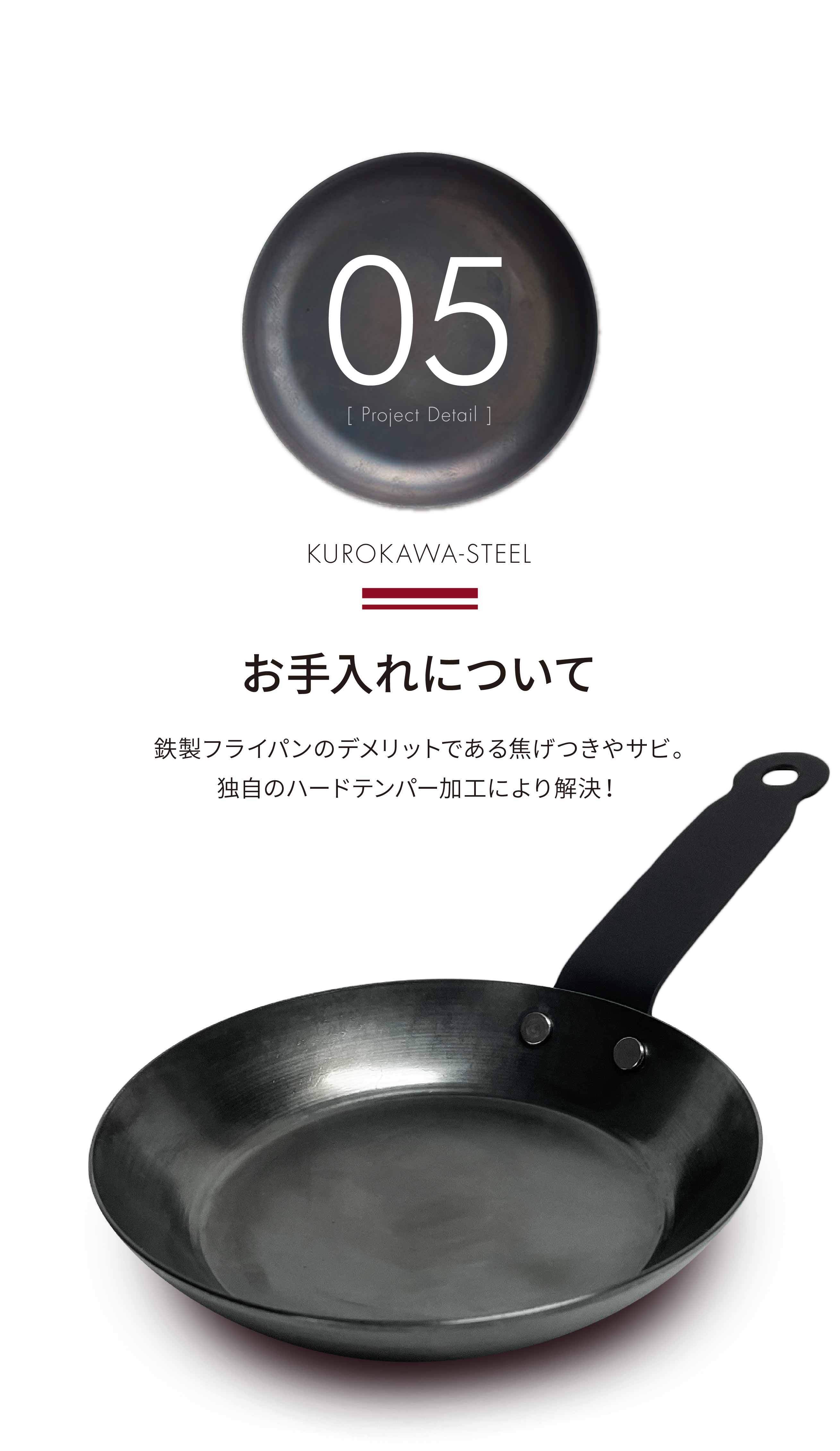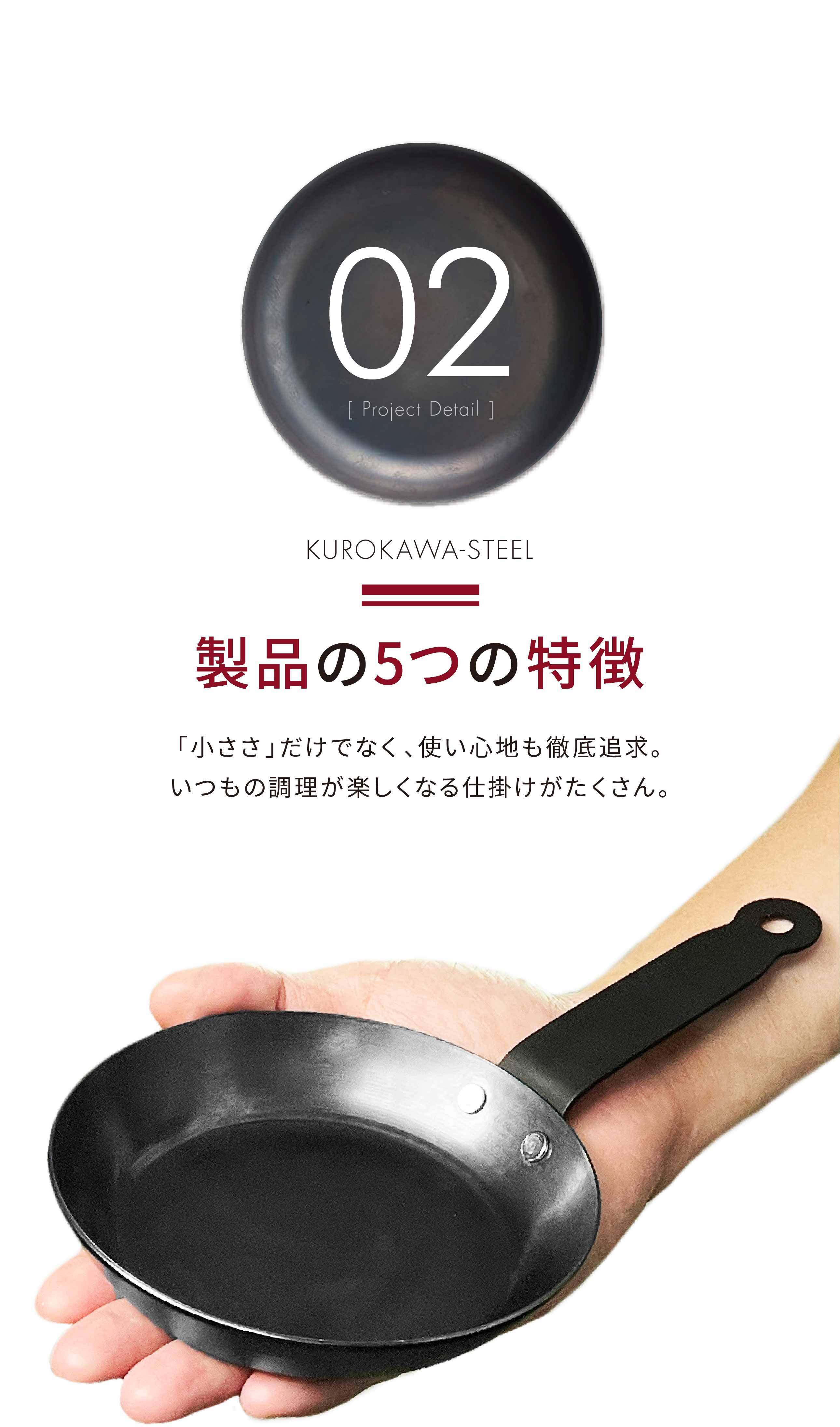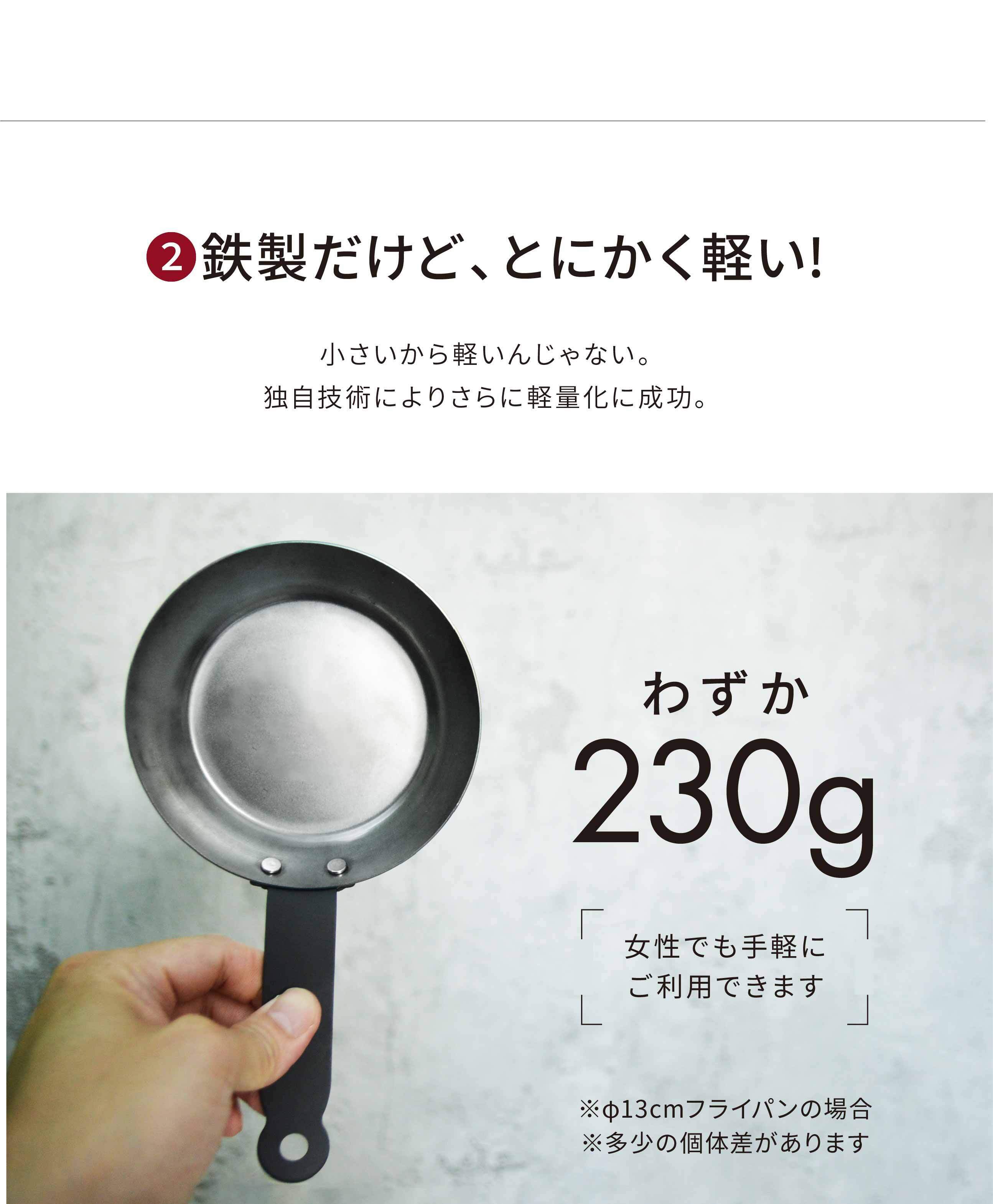 小さいから軽いのではなく、他社でほとんど使われていない「独自加工」により軽量化に成功。黒皮鉄の特性そのままに「鉄は重い」というデメリットを極限まで解消しました。