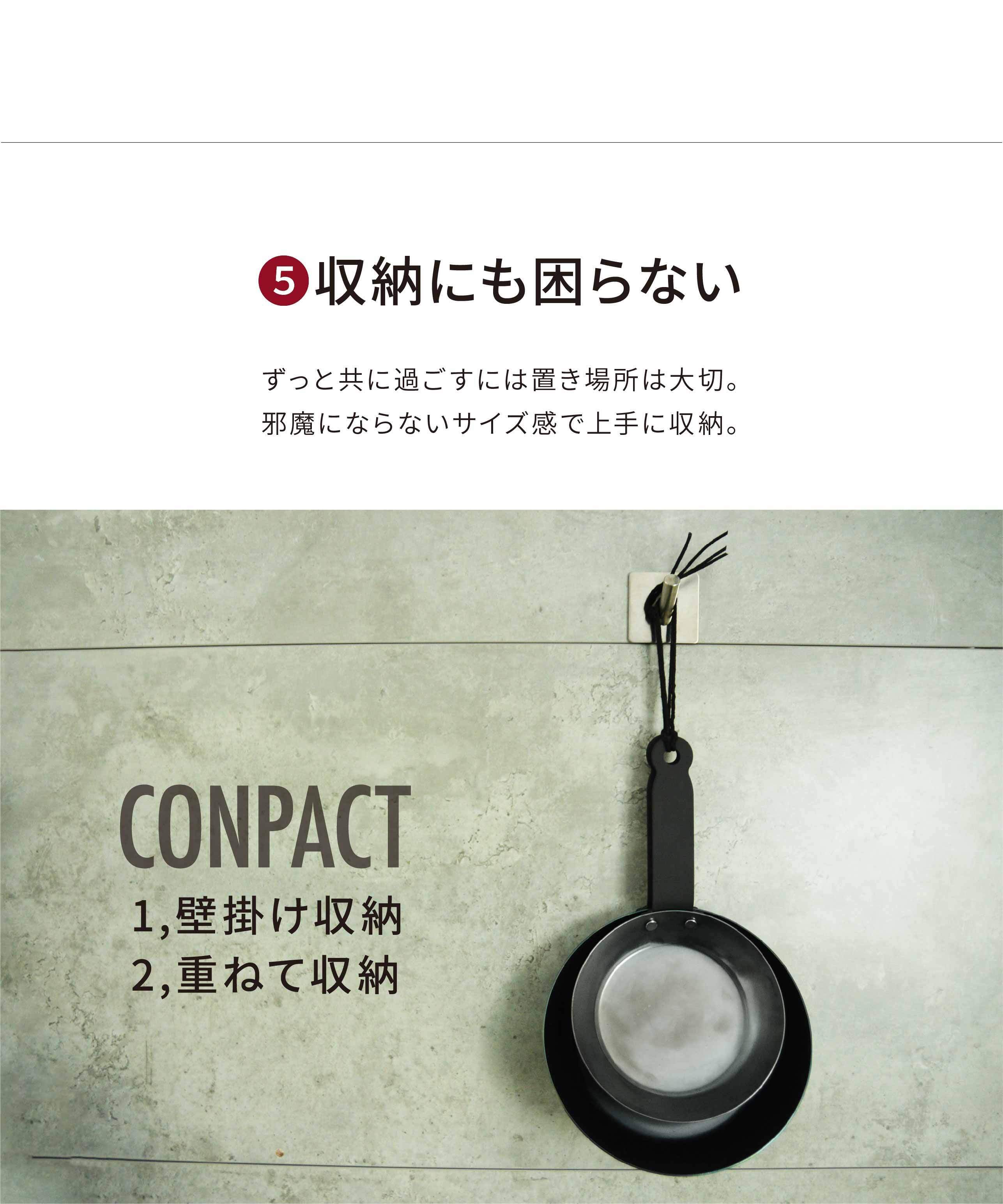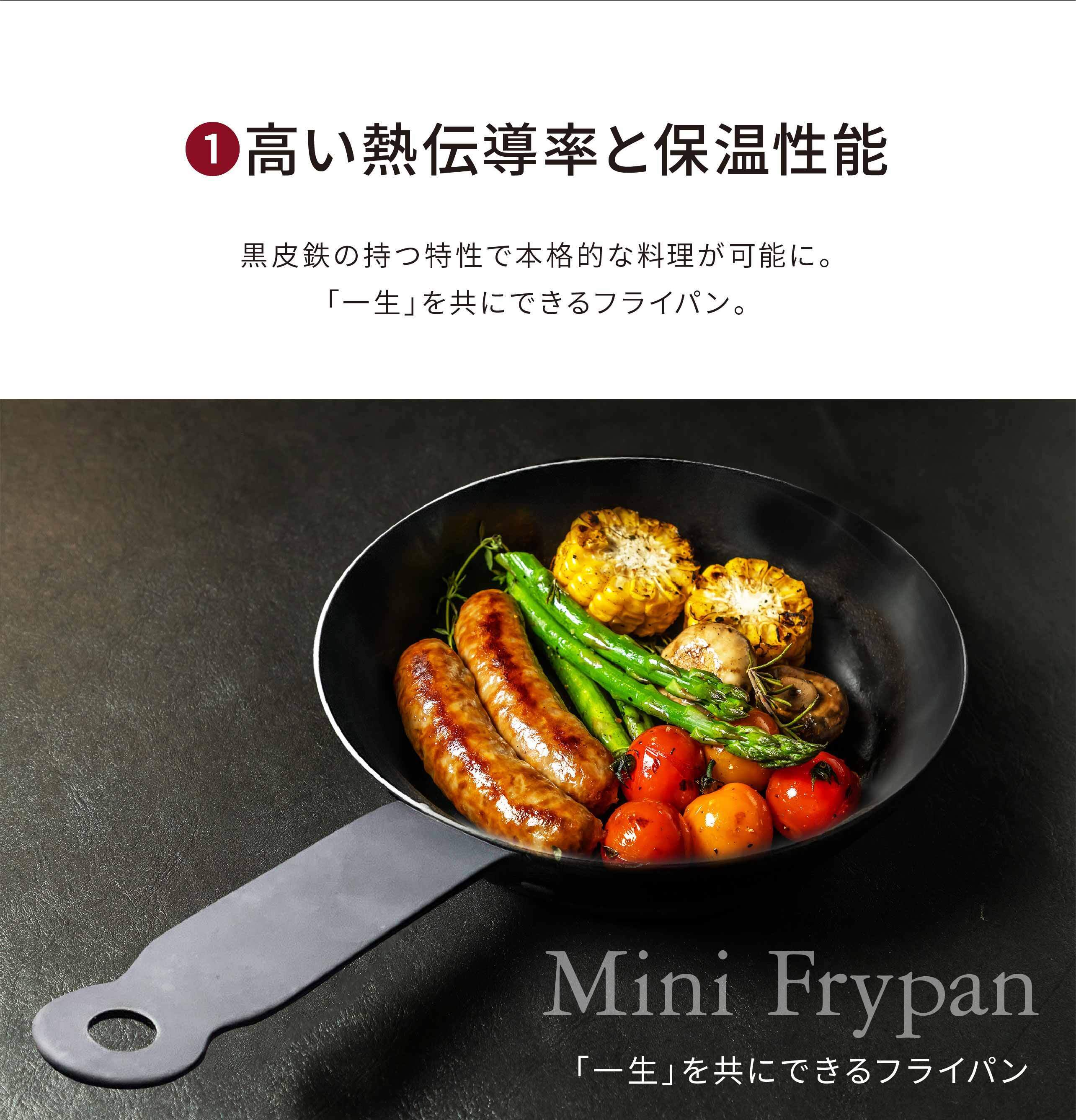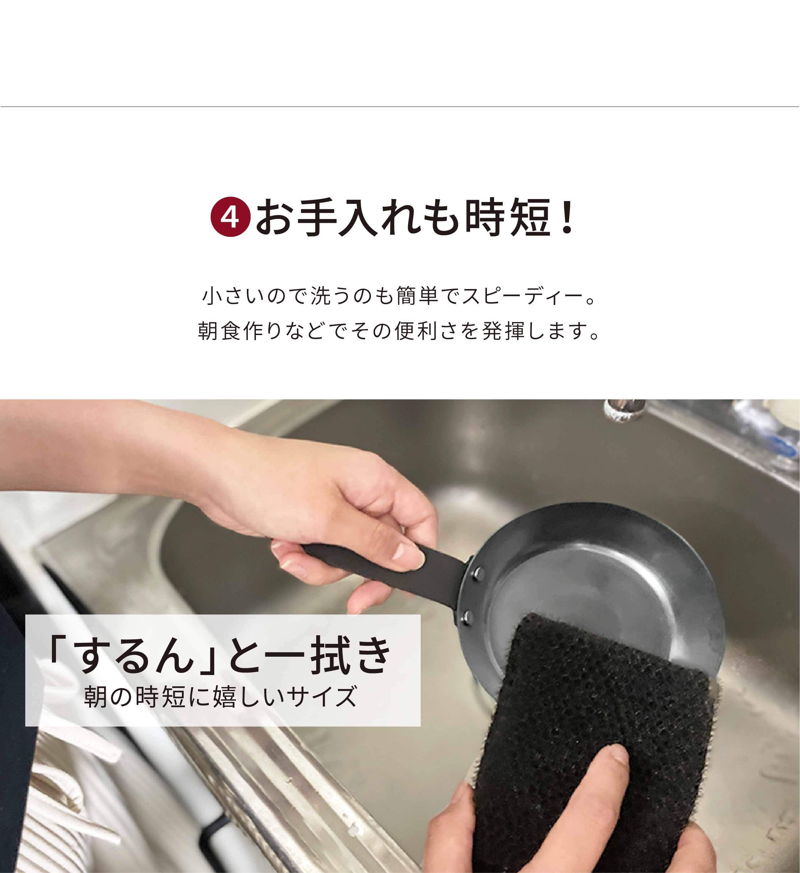 「忙しい朝に洗い物は減らしたい...」「洗い物がめんどくさい...」そんなあなたにピッタリなサイズ感。油に慣らした本体は「するん」と一拭きで綺麗に洗浄。洗い物が苦にならりづらいのもミニフライパンの魅力の一つです。