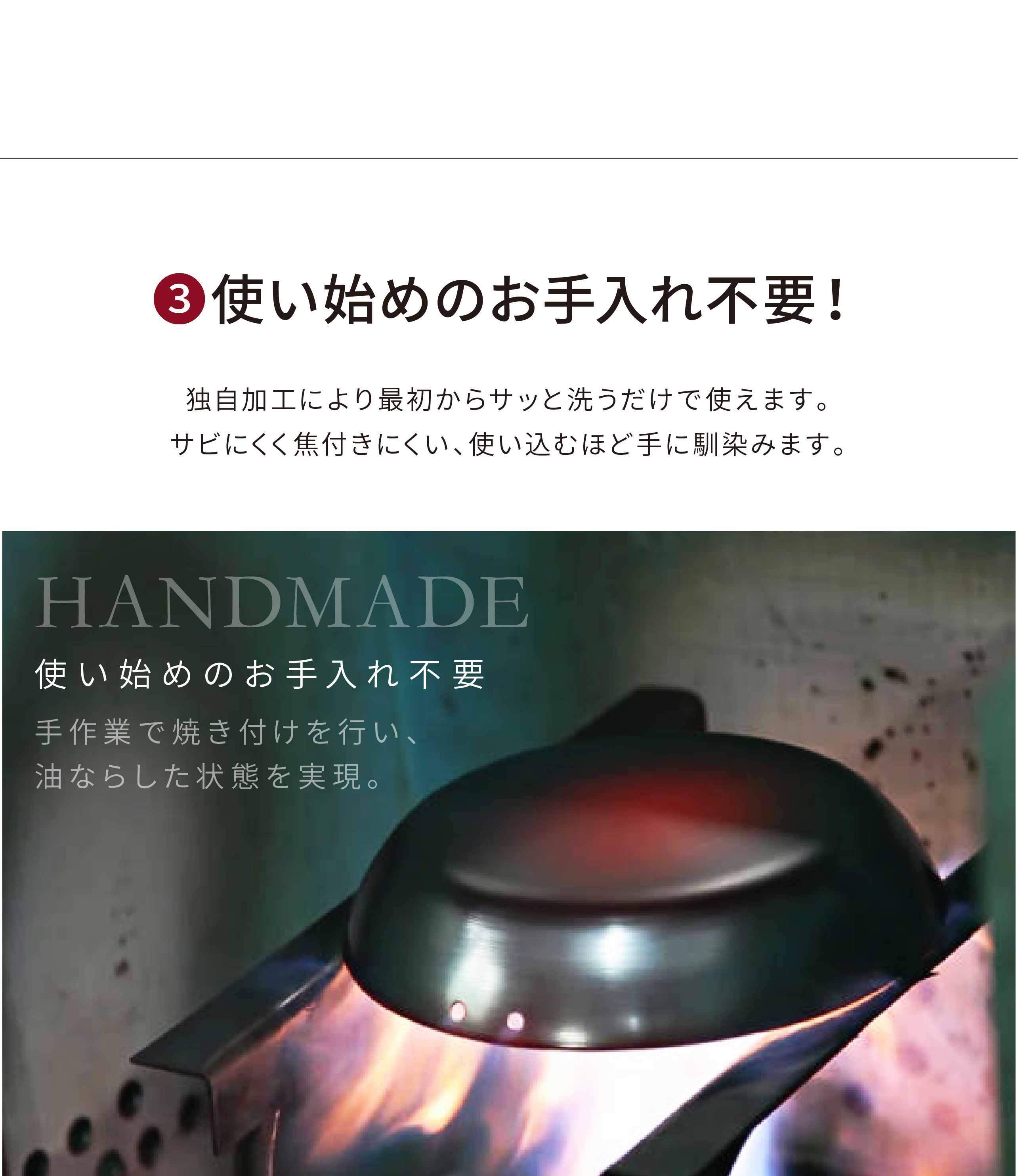 独自加工により、しっかり油がなじんだフライパンは扱いやすく、一生を共にできる相棒に。「サビにくく」「焦げつきにくい」、手元に届いたらサッと洗ってすぐに使えます。