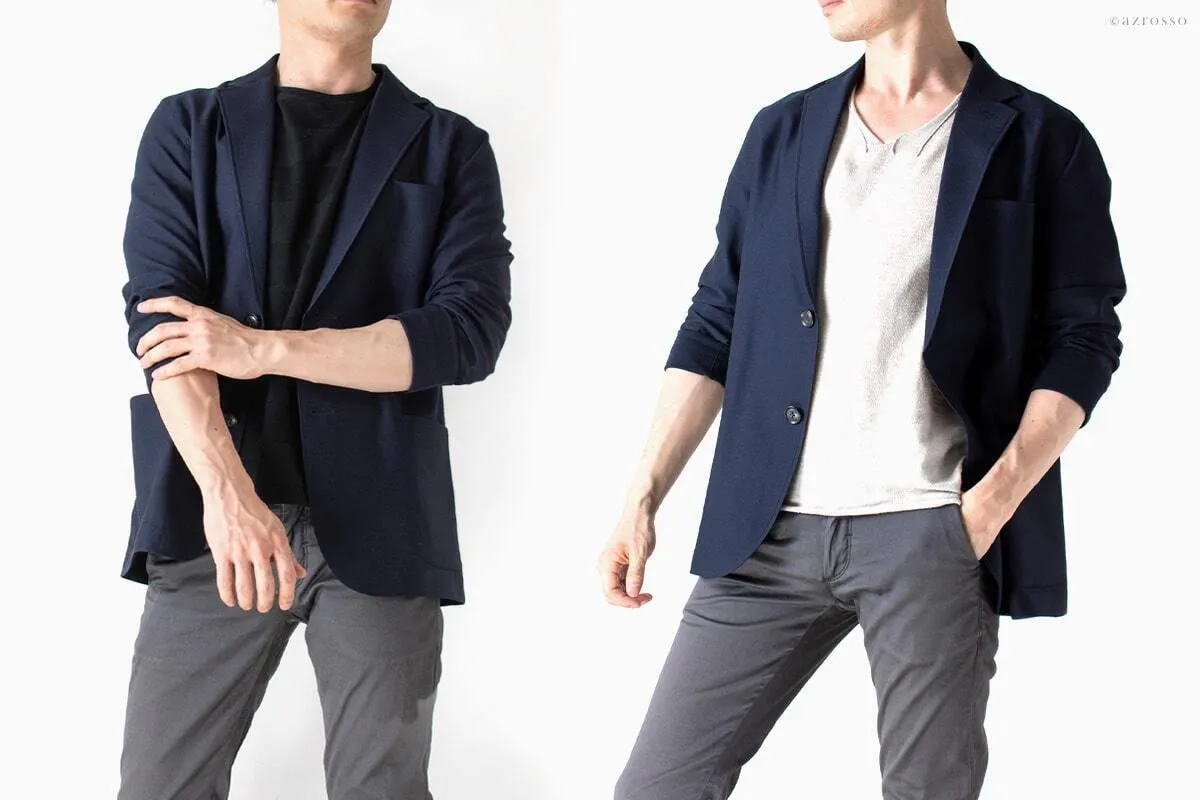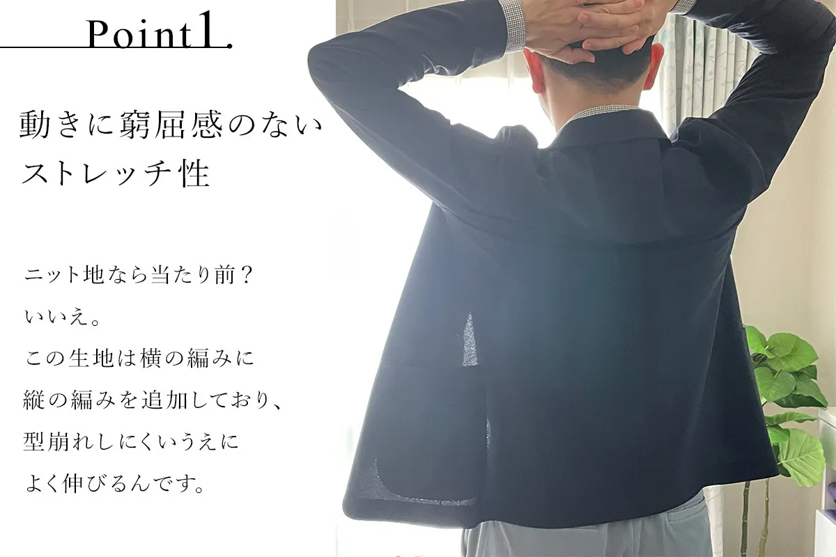 まず、ジャケットなのに、動きに窮屈感のないストレッチ性。これはニット編みだからできることです。しかし、ニット編みの欠点は型崩れしやすいこと。