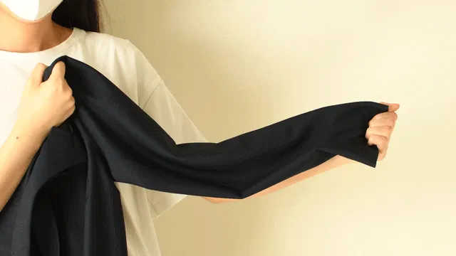「着てみてください。ね、すごい軽いでしょう。織物じゃなくてニットなので、体を動かしても快適に伸び縮みするんです。しかもキックバック(*ニット素材で使われる、伸びた生地のもどりの良さ)も良い。こんな素晴らしい素材に出会ったことがありません。」
