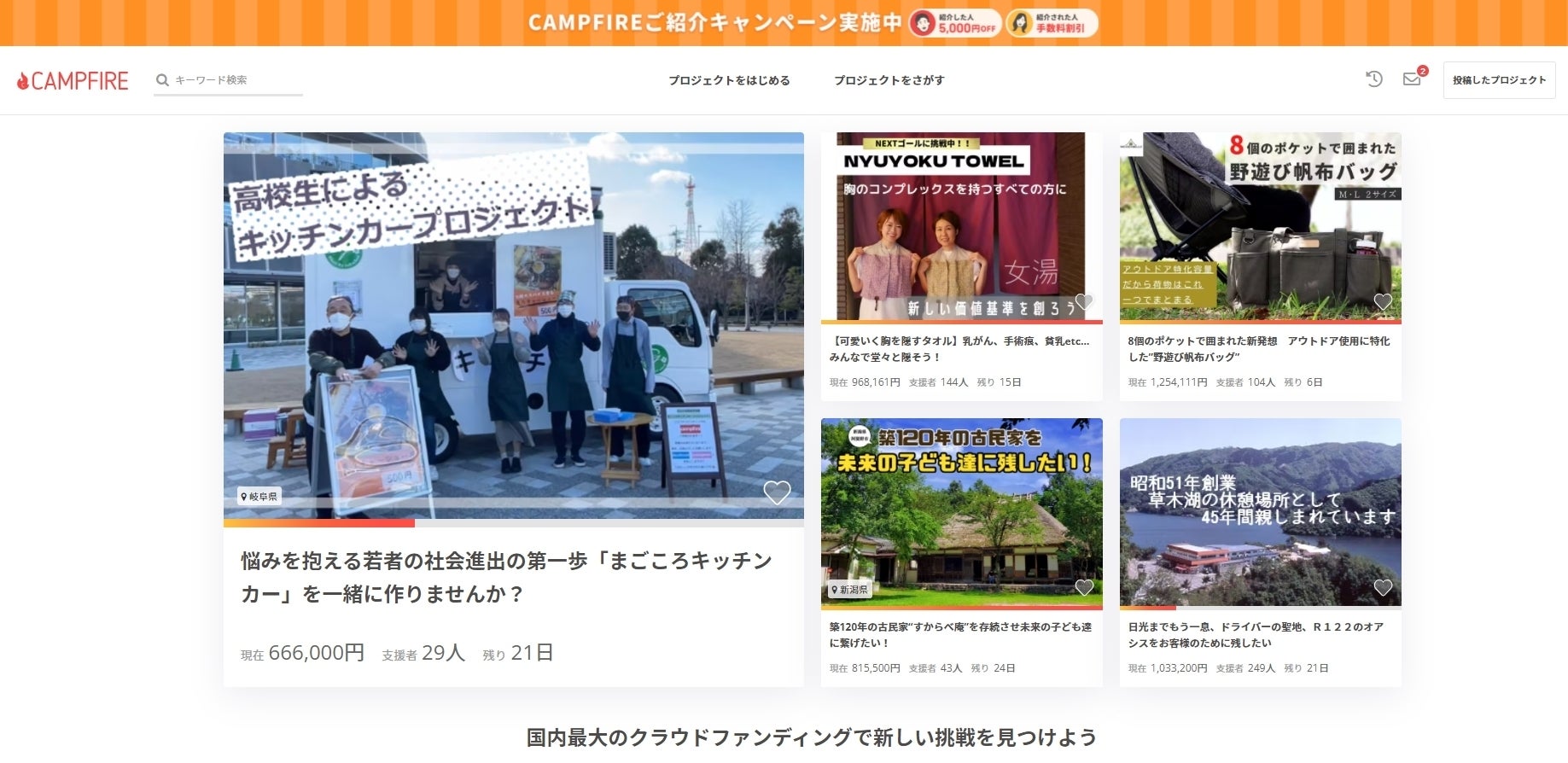 ご支援いただいている皆様のおかげで、なんと!本日よりCAMPFIREのTOPページに掲載されています。本当にありがとうございます!