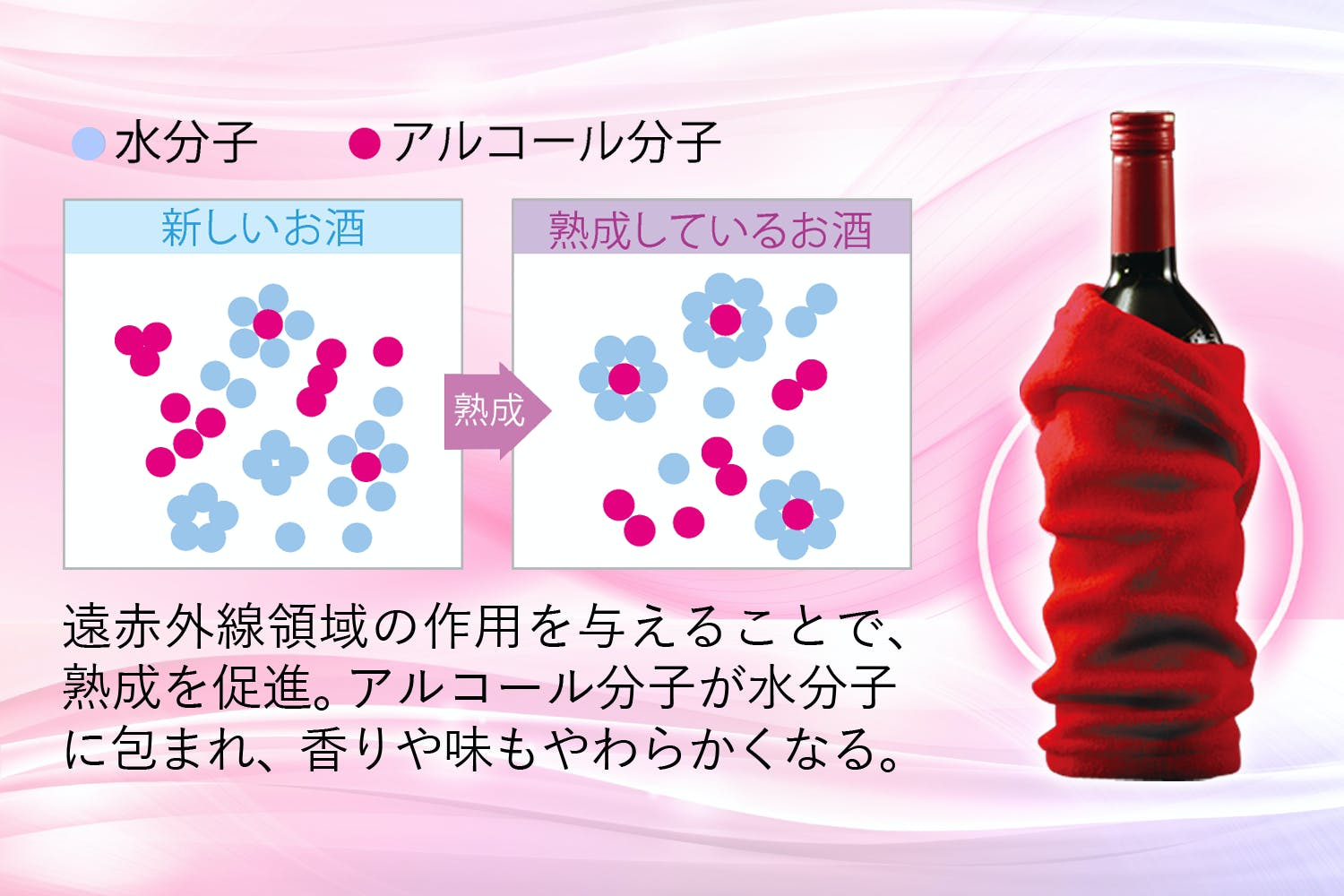 この結合をより密なものにするプロセスが“熟成”です。遠赤外線領域の作用を与えることで、容器内の水分子やアルコール分子に共振作用を起こし、熟成を促進します。