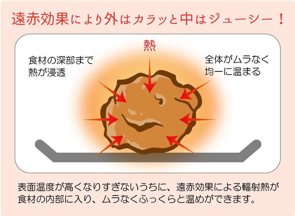 余分な油が落ちて表面はカラッとします。遠赤外線効果でムラなく温まりお肉はふっくらジューシーに!