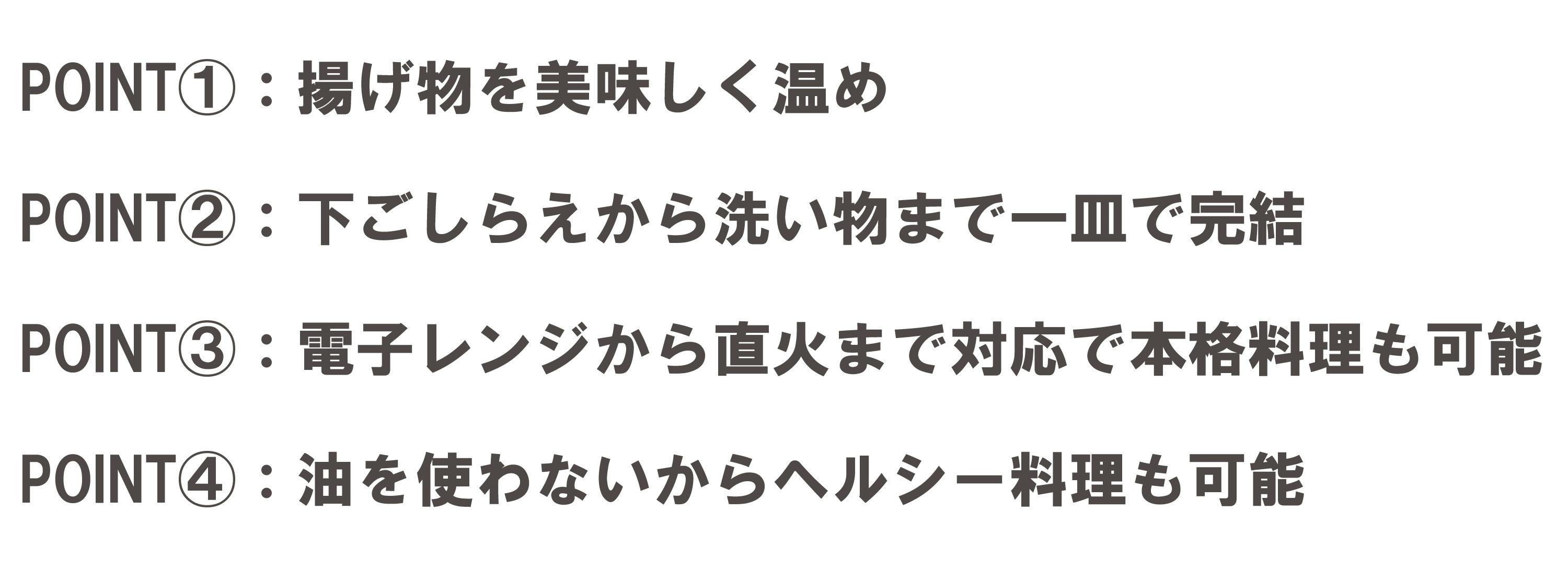 お惣菜や作り置きを、美味しく温め直すことができるお皿です。特におすすめなのは揚げ物!冷めてしまった揚げ物も、たった6分で揚げたての味が復活します!