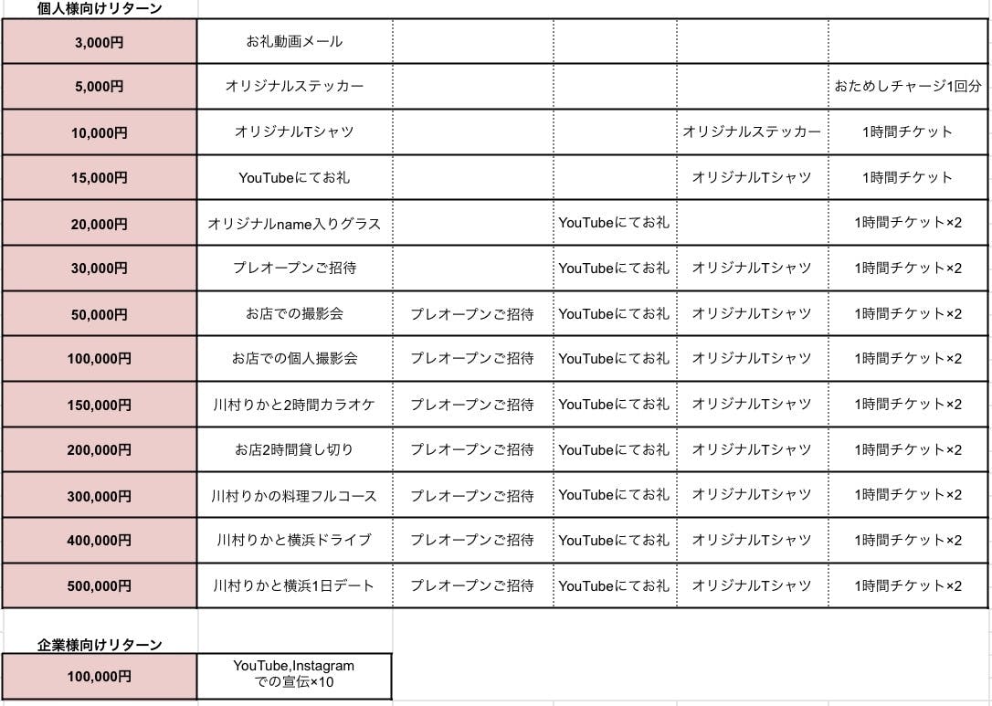 2021/12/07 19:58皆さんにご報告です!!!この度、皆さんのご支援のおかげ様で私の愛する横浜関内に待望のCAFE&BARをオープンすることになりました!!!( ; ; )!!!内装はまだまだ手付かず、お酒の種類なども初めのうちは揃えられなかったりCAFEの運営までもう少し時間はかかりそうで自分の理想とはまだまだ程遠いですがなんとか、、、なんとか店舗のGETまで漕ぎ着けました( ;∀;)みんなと会える!集まれる!!!開業レベル1の川村ですが記念すべきLapin生誕祭に来て頂けるととても嬉しいです!!!---------------------------------------------------------Lapin ChampignonOPEN: 12月26日(日)12月26日(日) 11:30〜15:00 20:00〜24:0012月27日(月) 11:30〜15:00 20:00〜24:0012月29日(水) 11:30〜15:00 20:00〜24:0012月30日(木) 11:30〜15:00 20:00〜24:00オープン予定が間近と言うことで4日間設けさせて頂きました。プレオープンは昼の部になりますので、プレオープンご招待のリターンでない方は夜の部のみになります。☆予約方法☆12月12日(日)12:12よりご予約開始!!!店内がとても狭い為、完全予約または紹介制となりますので御来店の際はお店のInstagram【https://www.instagram.com/lapin_champignon/】のDMにて・お名前・日にち・時間・人数の記入をお願い致します。お店の質問などもこちらのDMにてお願い致します。※Instagramのアカウントをお持ちでない方は【lapin.champignon.reserve@gmail.com】に上記の記入をお願い致します。メールの方は返信が遅くなることをご了承ください。☆住所☆※非公開となります。ご予約いただいた時点で場所などお伝え致します。関内駅から 徒歩10分馬車道から 徒歩4分日本大通り駅から徒歩4分☆システム料金☆①飲み放題プランa.60分 6,000円b.フリータイム 13,000円ハウス焼酎・ウイスキー(ミネラル・ウーロン・乾き物付)②ボトルキープ制 セット料金プランa.60分 6,000円b.フリータイム 13,000円(ミネラル・ウーロン・乾き物付)③ドリンク単品プラン60分 4,000円※延長30分2,000円(自動延長制)※税・サービス料別途10%・この4日間だけ昼の部もBAR特別プランでやらせて頂くことをご了承ください。・チャージリターンの方は500円引きになります。・1時間券リターンの方はこの4日間のみ昼夜お使えになりますが 1日1回までとさせて頂きます。・ランチなどご用意はないのでこの4日間のみ[食べ物限定持ち込み&出前OK] にします!こちらでご用意できなくてすみません(>人<;)尚、全てのチケットの期限は2022年2月末までに変更させて頂きますので今回予定が合わない方は別の日でもお使いなれますので心よりお待ちしております。---------------------------------------------------------ワンオペの為、至らない点が多々あるかと思いますが少しずつでも皆さんに愛していただける皆さんが笑顔になれるお店になるために精進して行きますのでよろしくお願い致します!!!!伝え忘れてることないかな_:(´ཀ`」 ∠):2021年大変だった今年も終わりよければ全てよしーーー!!!!!!!な年末を一緒に過ごしましょう♡♡♡ もっと見るクラファンリターンname入りグラスについて