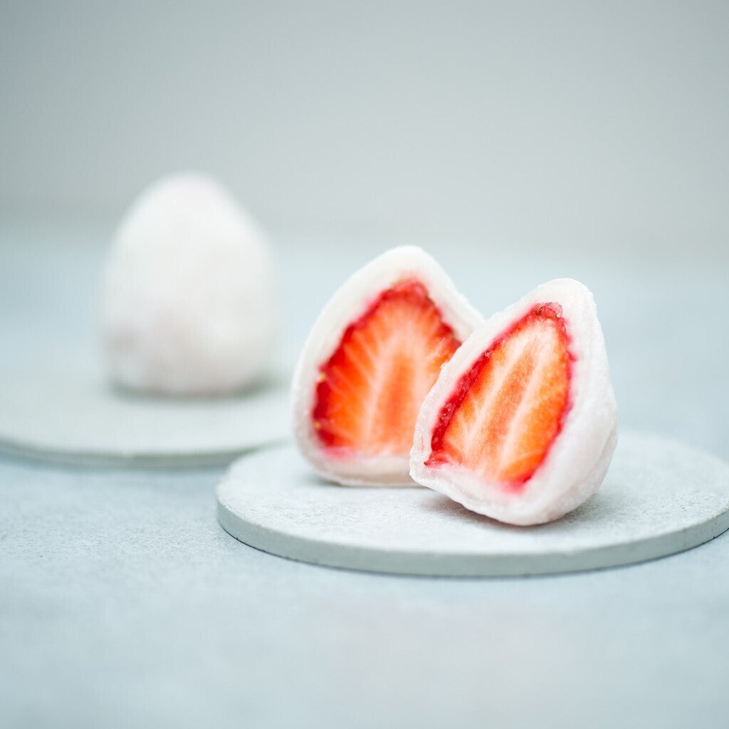 餡と求肥はできる限りシンプルなものにこだわりました。餡は甘さと水分量を極力抑えて白豆本来の風味を残す特別な配合・製法にしています。求肥は1mmという薄皮にこだわりました。薄皮 × スッキリ餡でフルーツを包み込むことで、フルーツの絶妙なジューシーさと美味しさ際立たせまる、高級フルーツ大福です。
