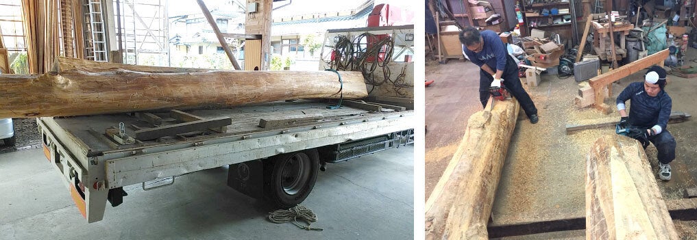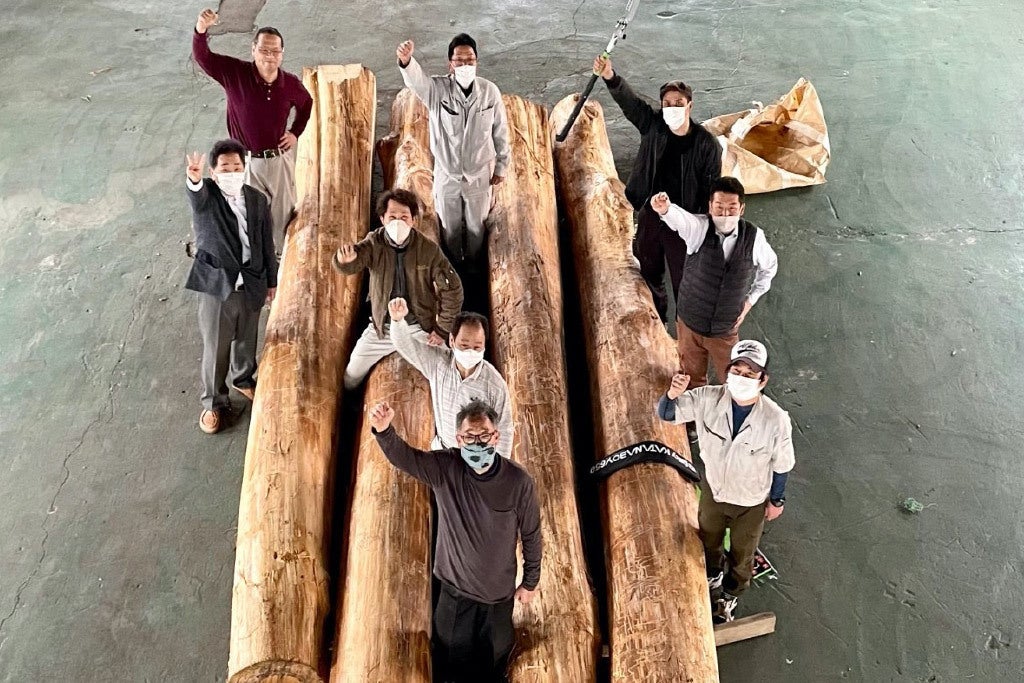 2021年4月、今回の柱となる材料を搬入。この柱は「地元の天然ヒノキ丸太」で、元口径が≒55cm程度。丸太4本柱で支えるためには、この太さが重要なのです。樹齢は≒250年以上は有る物と思われ、一般に植林されたヒノキよりも高い強度があります。(天然乾燥で数年保管)