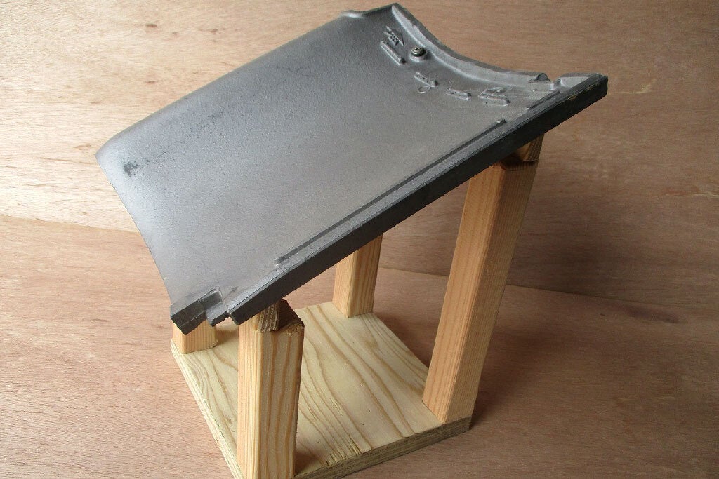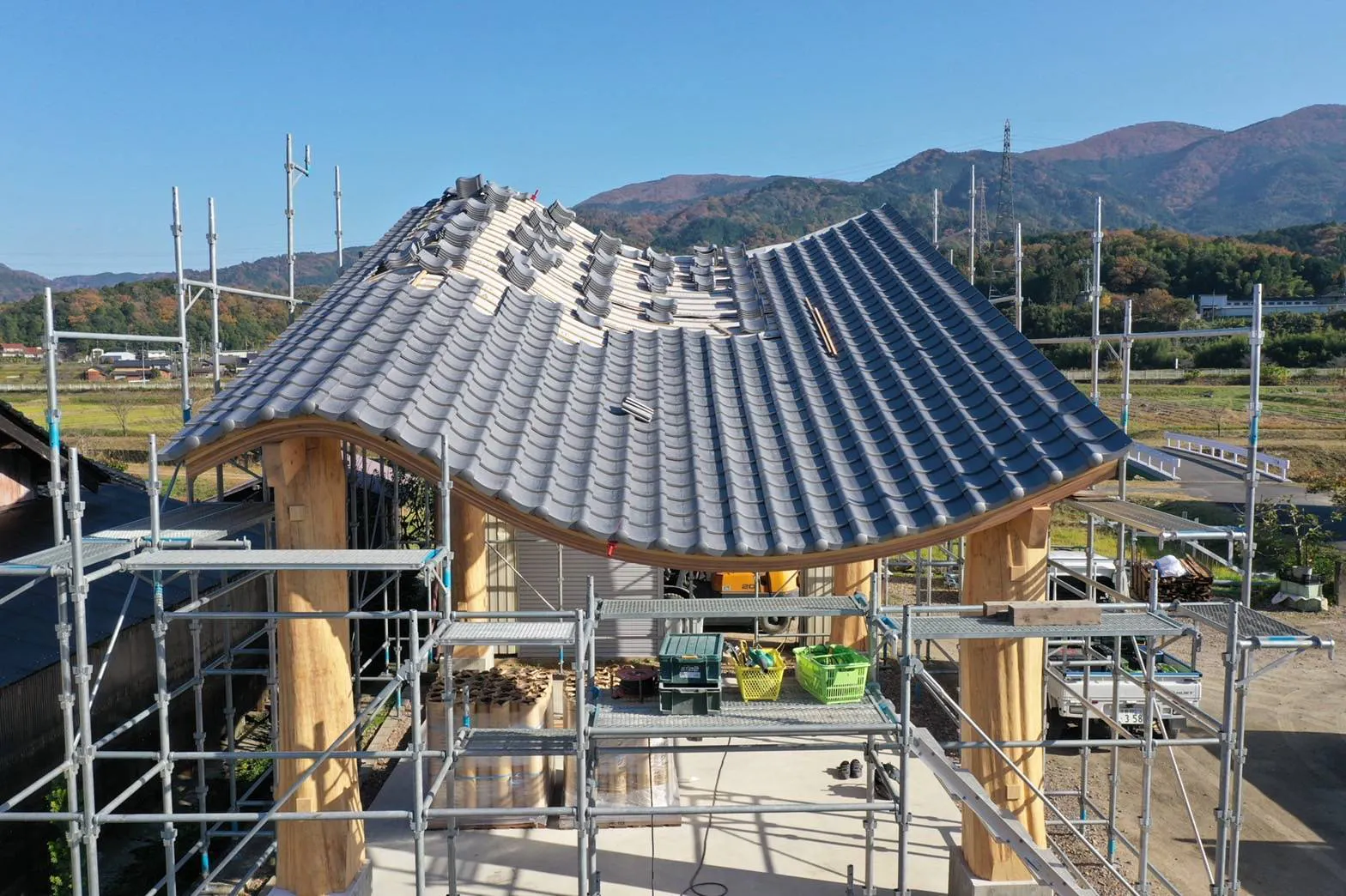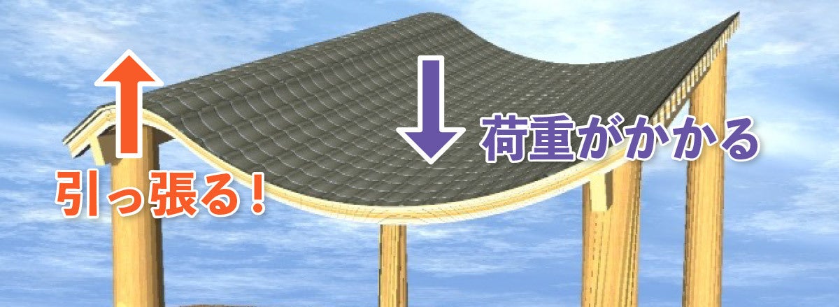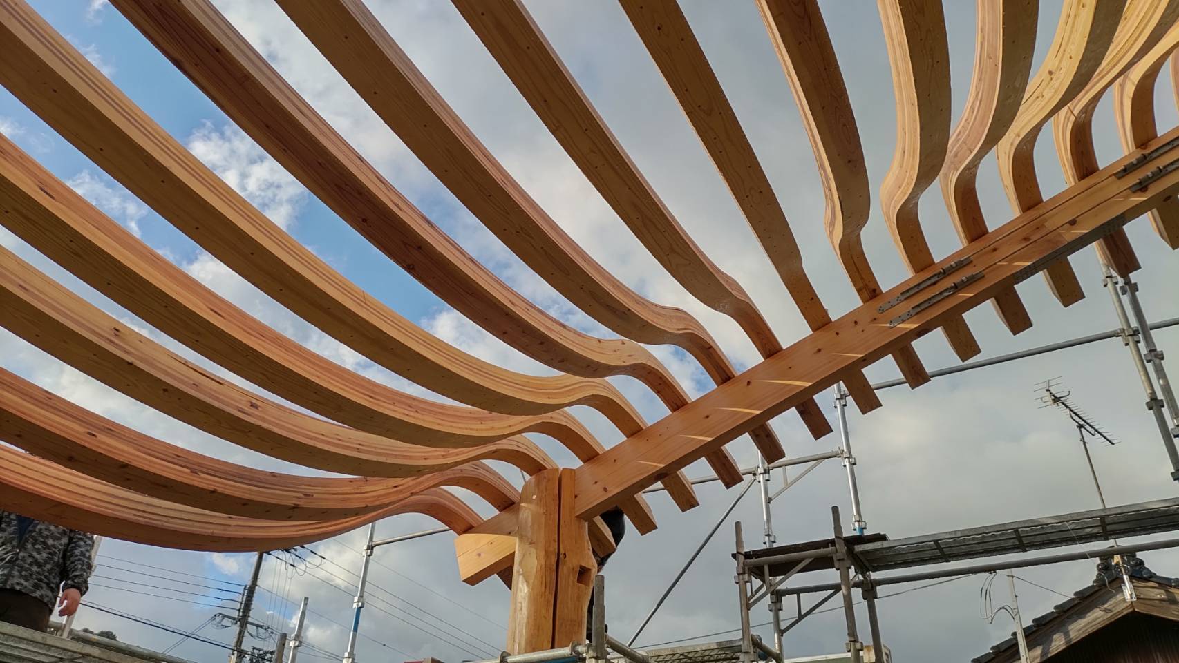 治具を駆使し、幅12cm・厚み12mmの杉板をカーブさせて12枚重ねる…この曲げ梁を25本つくり、1つの屋根が完成。実に、300本の杉板を使用します。さらに瓦葺きと、4本の柱のみで支える構造は、建築に携わる方なら、常識では考えられないことがお分かりいただけると思います。