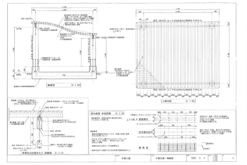 この一見不可能と思われる設計を田原氏にお願いしたところ、耐荷重的にも問題のない構造で、形にしてくださいました!その中で考案された方式が、杉板を12枚重ね合わせて1本の梁に仕上げるという「湾曲積層梁」の技術です。