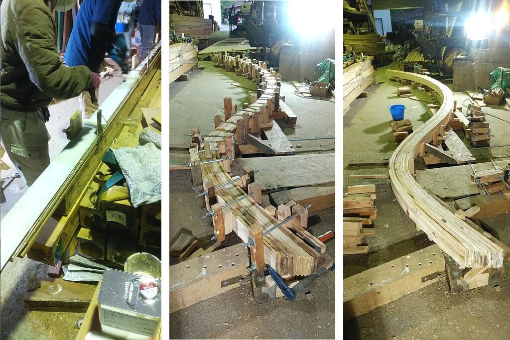 6m×12cm×12mmの杉板を、1本の曲げ梁に12枚使用。様々な加工法を考案する中で、木工用ボンドに耐水性硬化剤を混ぜることによって摩擦力が減り、曲がりやすくなることが判明。専用に開発した治具で30箇所を固定し、形を保持しながら、実際に曲げるのは人間の力です。これを12枚同時に曲げるため、一日に曲げ加工ができる本数はたった1本と、根気のいる作業が続きます。