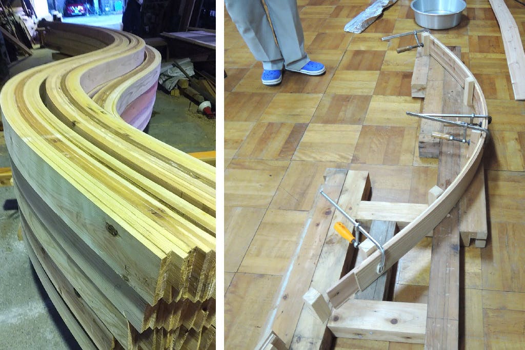 曲げた積層梁のサンプル制作。実験の結果、出来上がった積層梁は、大人が乗っても、たわみはほぼゼロ!