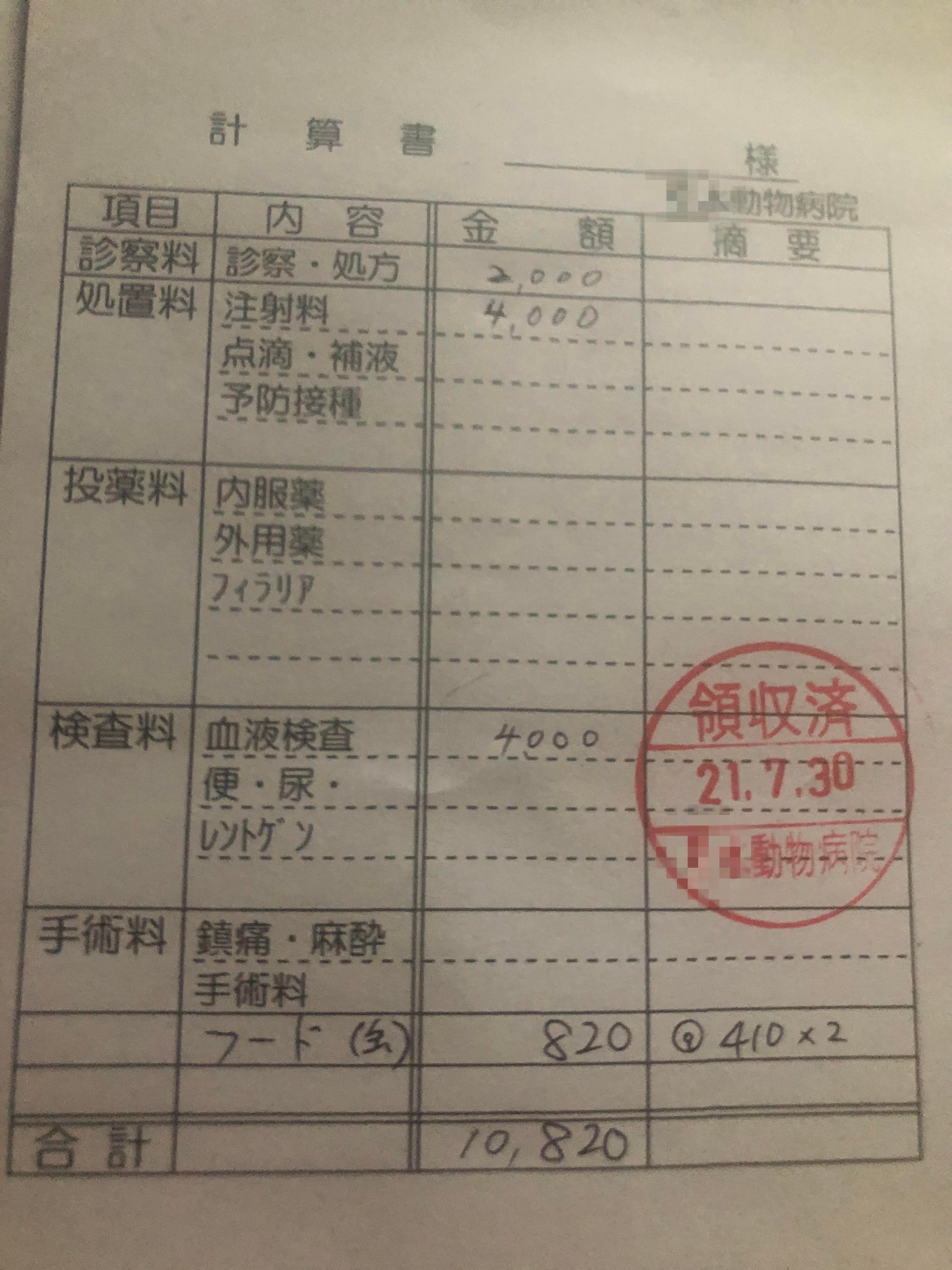 (※こちらの計算書は見積書ではなく保護した当日に受診したものとなります。)