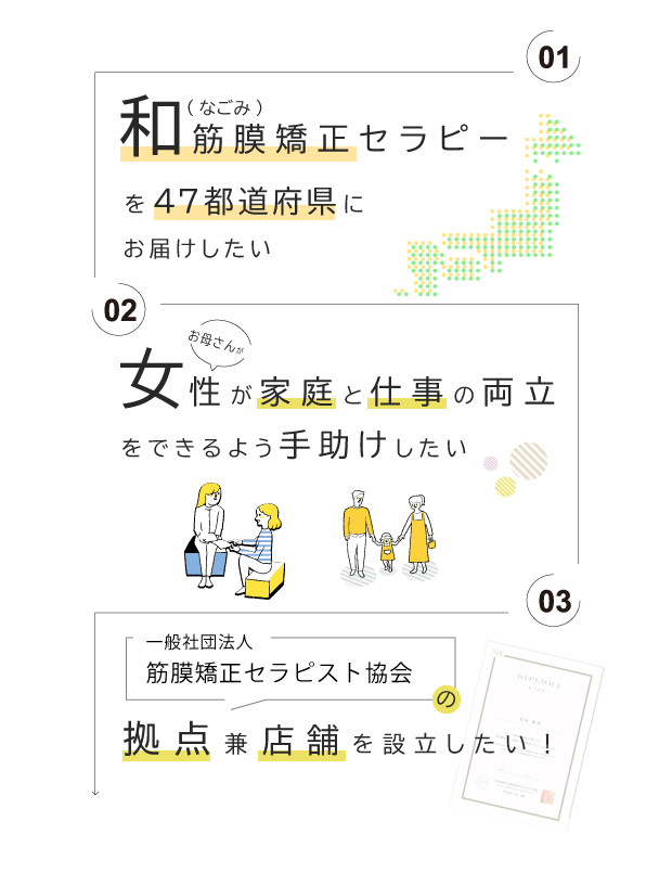「和(なごみ)筋膜矯正セラピー」 のサロンを武蔵小杉に出店して、事業運営がスムーズにできるようにするための体制を作ります。