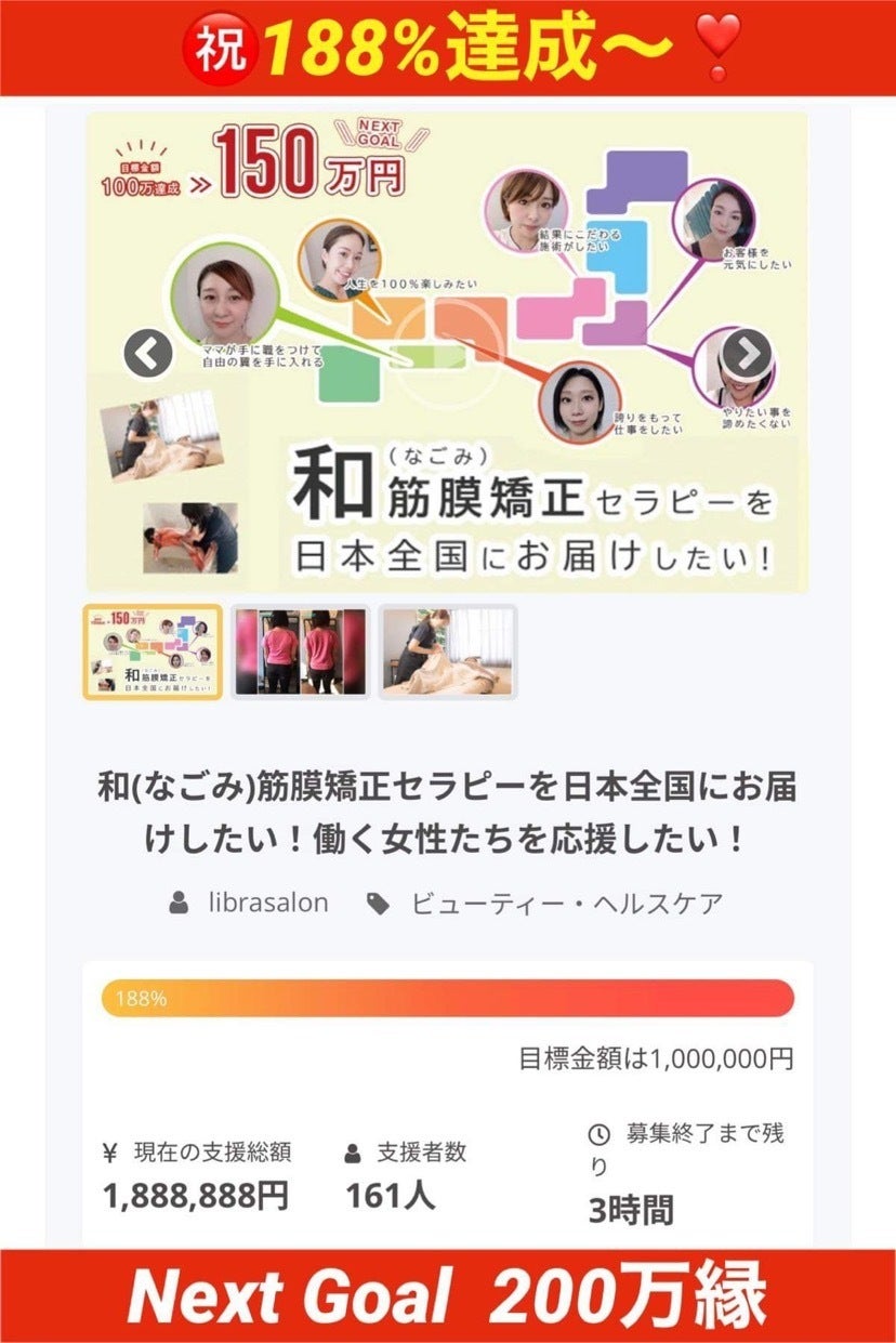 2021/10/01 08:25昨日までの40日間、心のこもった御支援・応援、本当に有難うございました!大阪代表/川目美樹です!お陰さまで当初の目標1,000,000縁に対して結果2,050,888縁(205%)という、物凄いご縁を戴け、達成することができました☆この40日間最初は全員の足並みが揃っていたわけではなく何をどうしていけば良いのかわからない時もありました。ですが、少しずつ御支援戴ける方そして、応援してくださる方が増えLIVEを拝見していただけたり、18名のメンバー、それぞれの投稿を目にしてくださった方がいらしてシェアしていただける方ないらしてどんどん『チーム』になっていく事ができました!御支援いただけた中にはここ数年連絡をとっていない友人知人クラウドファンディングの事を一言も伝えていない昔の仲間思いがけない身内挙げればキリがありませんが本当に沢山の方が見て、知っていただけている!応援してくださっている!と、メンバー一同日に日に実感しておりました☆最終日の2日前には、全員が本当に真剣であるからこその衝突があったり(一時はどうなるかと思いましたが笑)でも、これがあったから最後は本当に感動で・・・こんなにも応援していただける方がいらっしゃるのかと最終日の昨夜は、御支援の勢いが物凄くて…全員震えました涙が止まらないメンバーもいました御支援・応援・LIVE配信の視聴・コメントやメッセージ…あらゆる形のパワーをいただけました!!!!本当に皆様の愛情で達成することができ18名一同、心の底から感謝で満ち溢れています!本当に本当に有難うございますm(_ _)m今日、私達はスタートラインに立ちました今日からは176名の方々に、お礼のご連絡をお一人お一人心を込めてさせていただきます!時間は少しかかるかもしれませんでも早さより、心のこもった丁寧さを優先させてください☆40日間のお礼をしっかりさせていただき、それぞれ選んで戴けたリターンを、全身全霊でお返しさせていただきます!本当に、本当に、有難うございました☆大阪代表/川目美樹 もっと見る