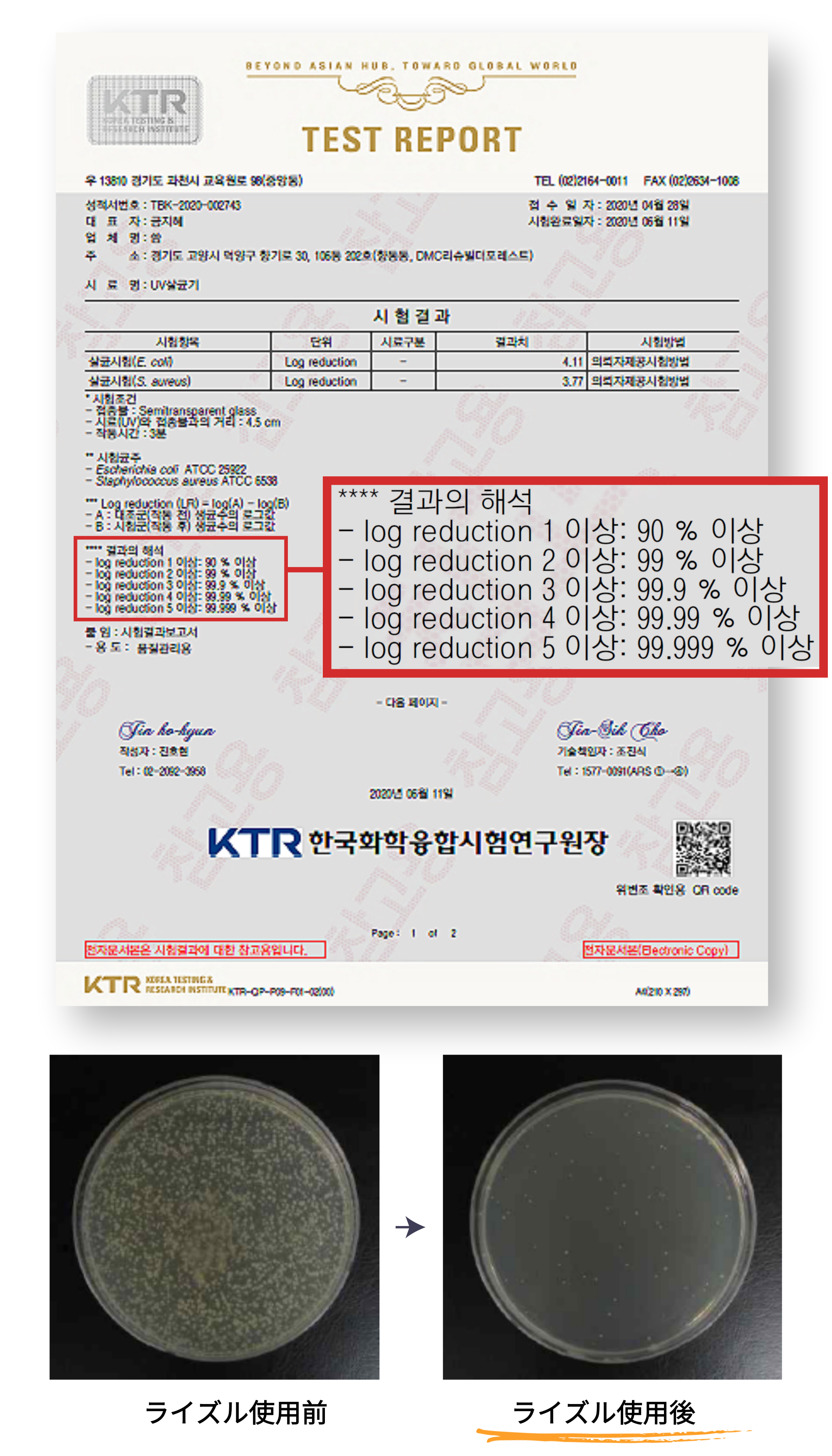 - 検査実施機関名称とURL:韓国化学融合試験研究院KTR除菌試験結果