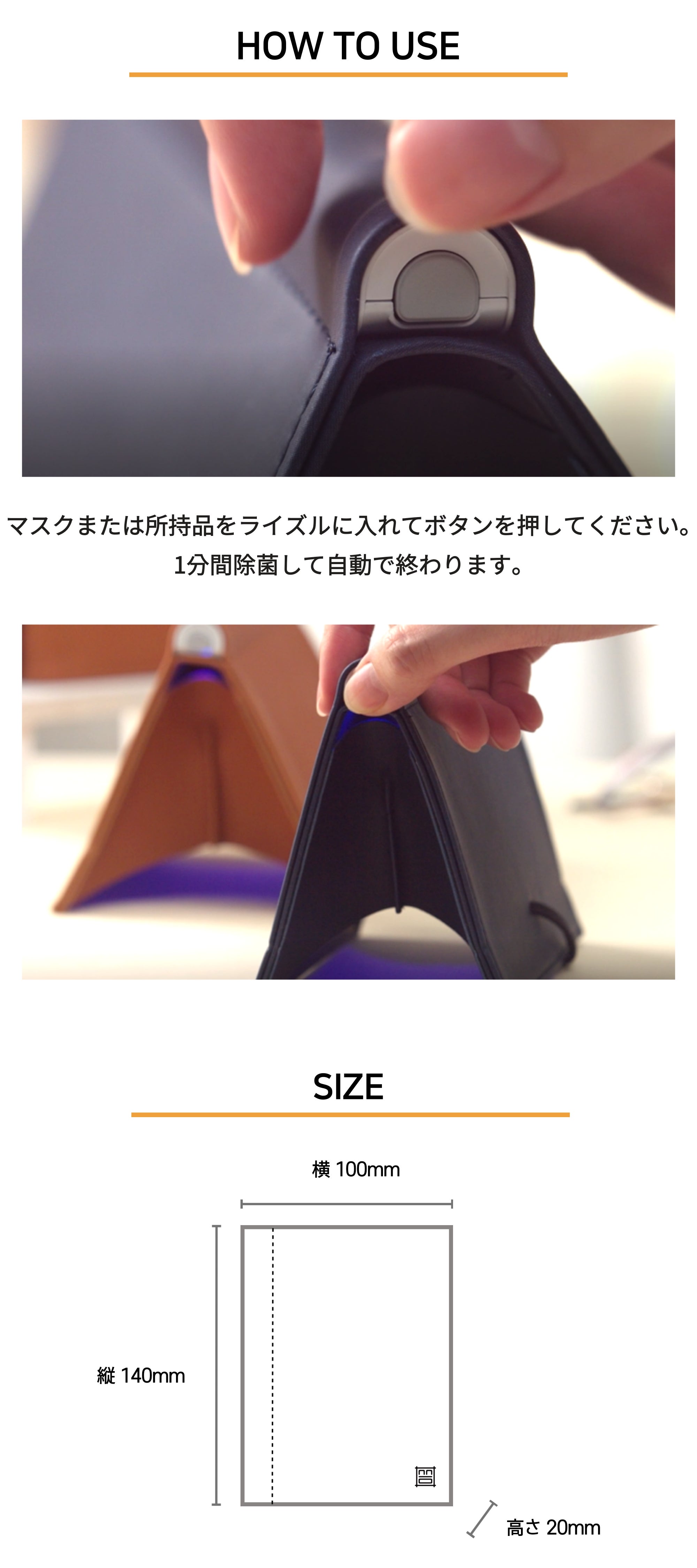 除菌したい物の上に置き、ボタンを押すだけ。1分間強力なUVLEDで除菌された後、自動で終了します。