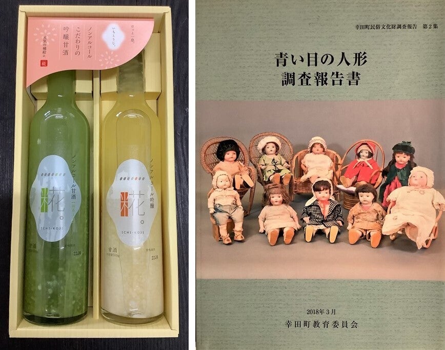 ●20,000円 お礼状、尊皇謹製 甘酒セット(白・抹茶 山﨑合資会社)、『青い目の人形調査報告書』(幸田町教育委員会)、コンサート付展示会招待券(3名分)