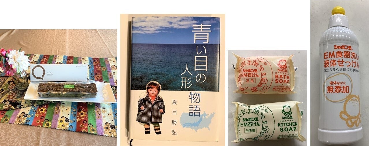●30,000円 お礼状、三河湾リゾートリンクス ホテル特製抹茶パウンドケーキ、『青い目の人形物語』夏目勝弘(成工社 出版部)、EM固形けん(浴用・台所用)&EM食器洗い液体せっけん、コンサート付展示会招待券(3名分)