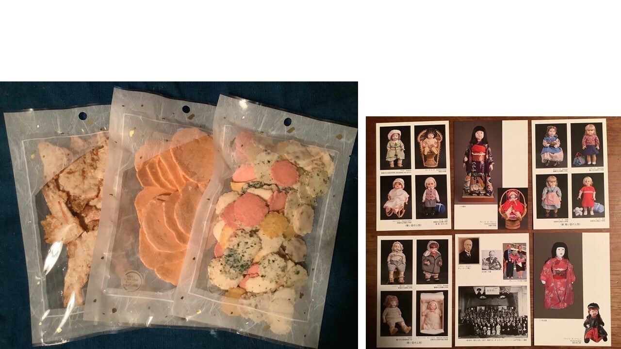 ●7,500円 お礼状、えびせんべい(CF限定仕様3種詰め合せ 中新本舗)、青い目の人形絵葉書セット(6枚入)、コンサート付展示会招待券(2名分)
