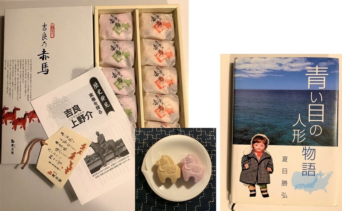●10,000円 お礼状、代表銘菓「吉良乃赤馬」最中(10個入 東角園)、『青い目の人形物語』夏目勝弘 成工社 出版部)、コンサート付展示会招待券(2名分)