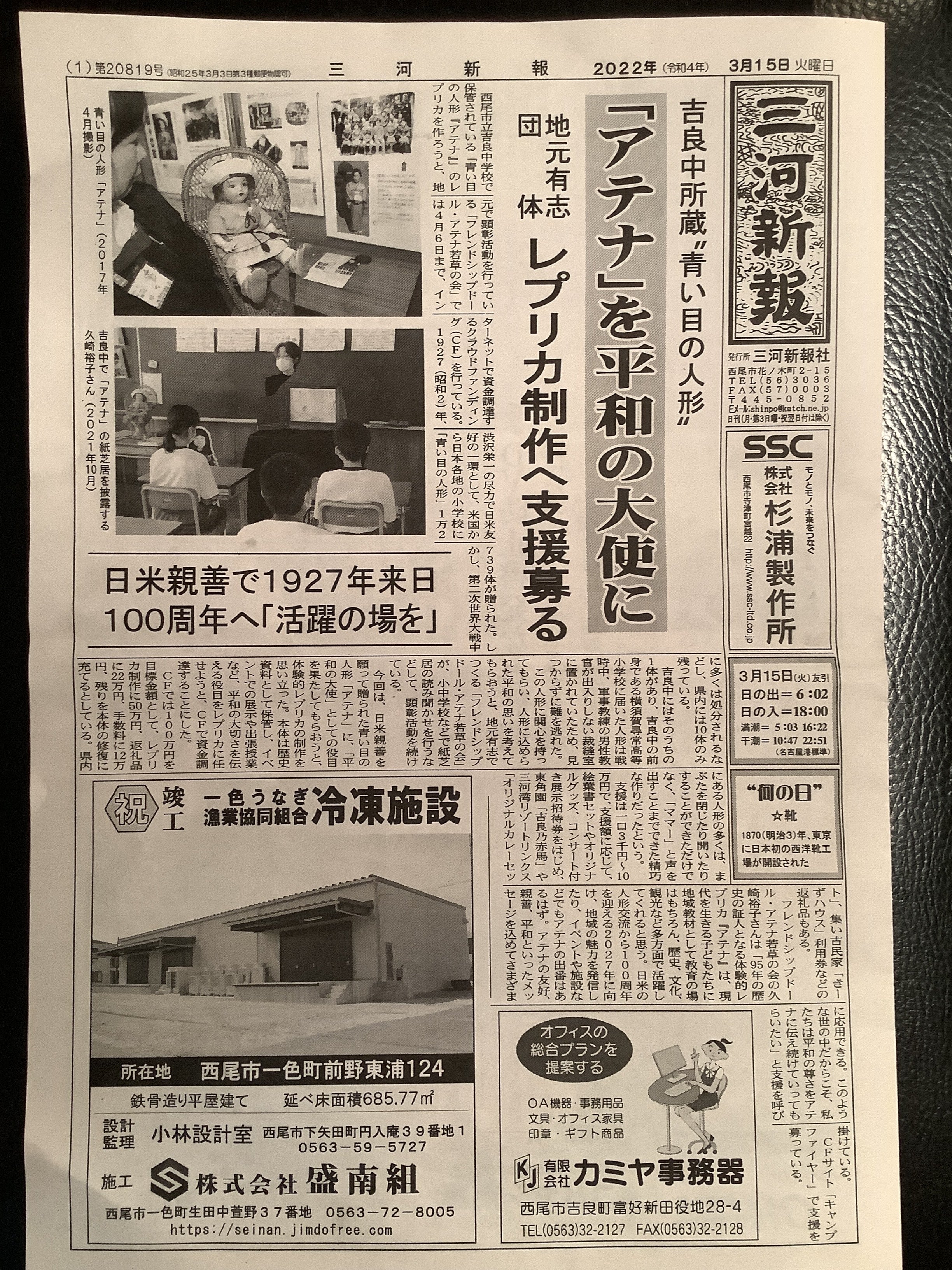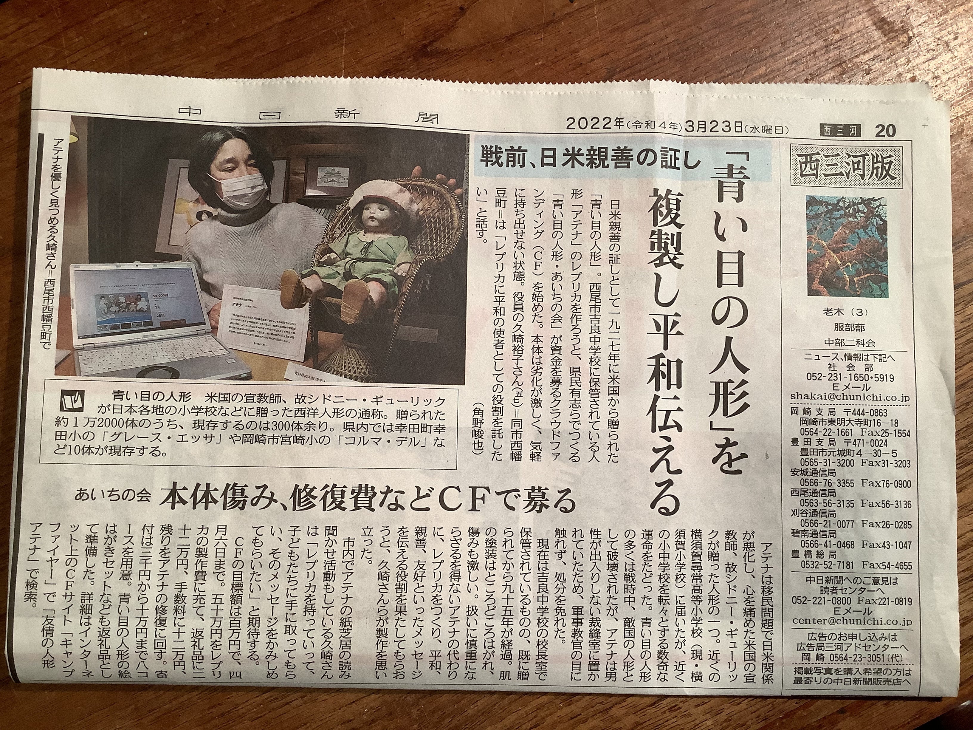 2022/03/17 14:09嬉しいことに、3月15日の『三河新報』一面に「アテナを平和の大使に」の記事が掲載され、皆さんから「見たよ」「頑張ってね」と声をかけていただきました。地元の新聞が応援してくれるのは、何より有り難いことです。地域の皆さんにアテナのことを知ってもらえることで、私たちの目標の半分は達成されたと言っても過言ではないかもしれません。その上で、さらに支援してくださる方が増えていけば、アテナもきっと喜ぶことでしょう。皆さんに、アテナの声が届きますように。 もっと見る